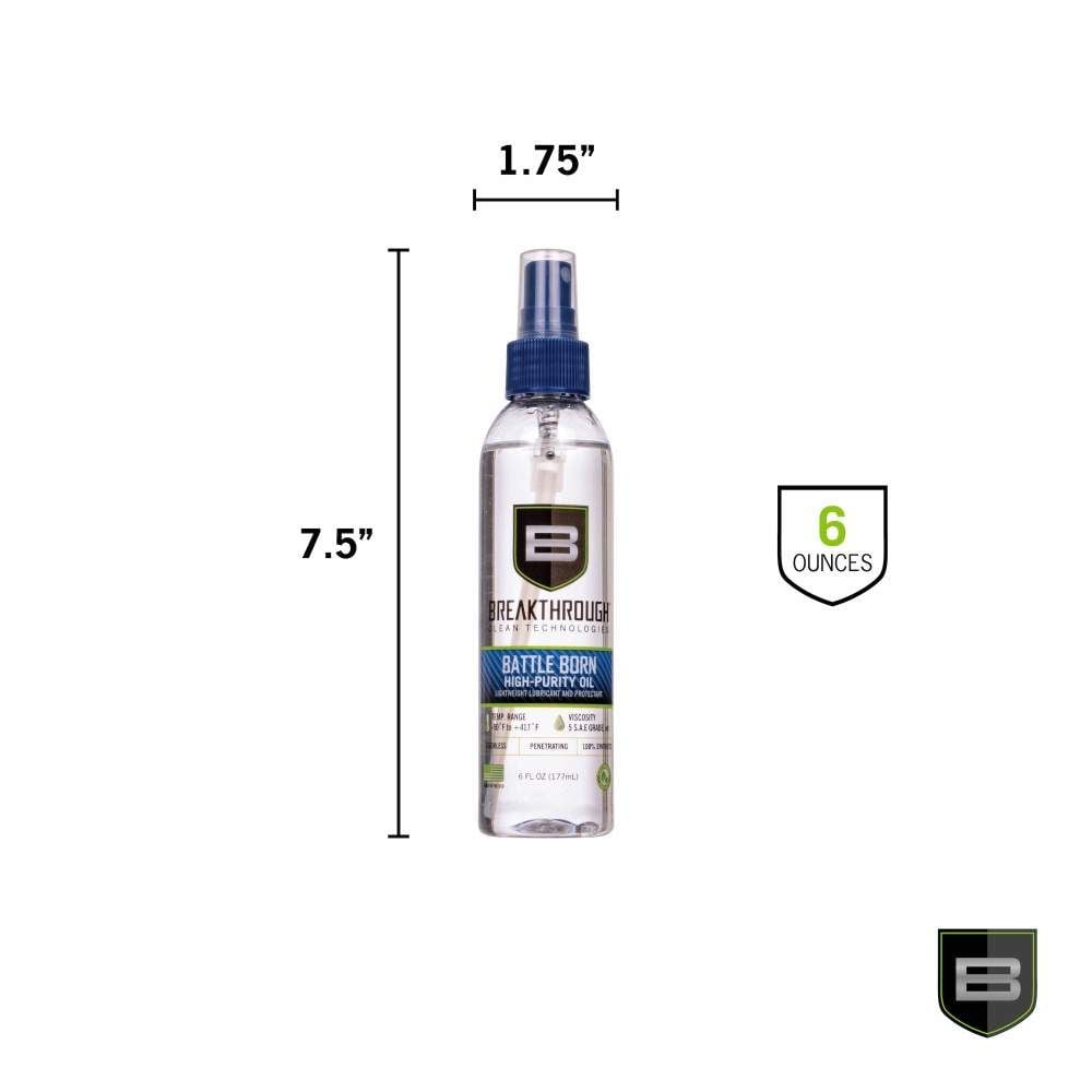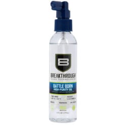 SKU: 22854 Categories: Cleaning / Lubricating Fluid, AR-15 Cleaning Kits, Tools & Cleaning DescriptionThe Breakthrough Clean Technologies® Battle Born High-Purity Oil, is a general-purpose low-viscosity oil that is a lighter version of our bestselling HP Pro Oil, is a blend of high-quality, 100% synthetic gun cleaning oils. This non-toxic, odorless lubricant is treated with the highest quality anti-rust, anti-foam, and anti-wear additives to provide ultimate and lasting corrosion protection and lubrication under extreme pressure and a broad temperature range (from -90°F to 417°F).