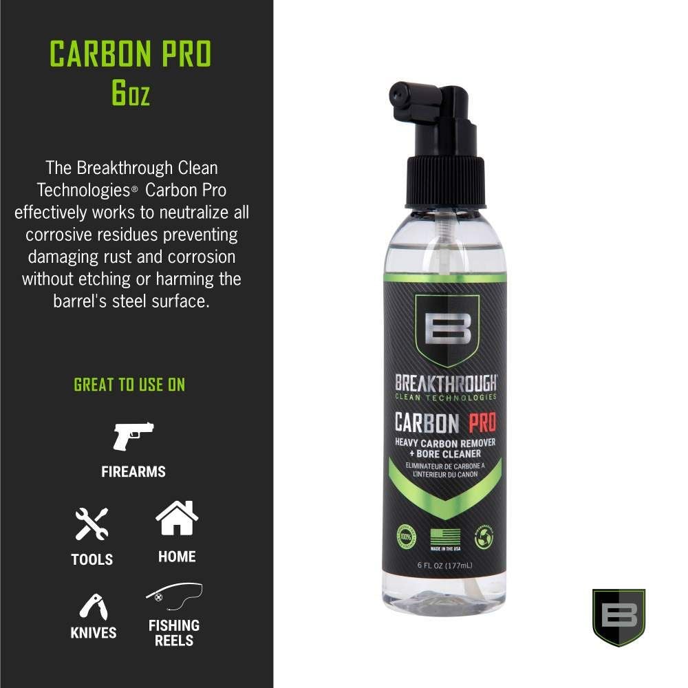 SKU: 22849 Categories: Cleaning / Lubricating Fluid, AR-15 Cleaning Kits, Tools & Cleaning DescriptionThe Breakthrough Clean Heavy Carbon Remover is a water-based cleaner that removes heavy carbon and lead deposits from your firearm. Utilizing a proprietary blend of chemical surfactants and detergents, our degreaser effectively neutralizes all corrosive residues, especially on the gun’s barrel and bore. It prevents damaging rust and corrosion without etching or harming the barrel’s steel surface. Primarily used to clean and maintain firearms, this carbon remover also works on cars, aircrafts, boats, and motorcycles.