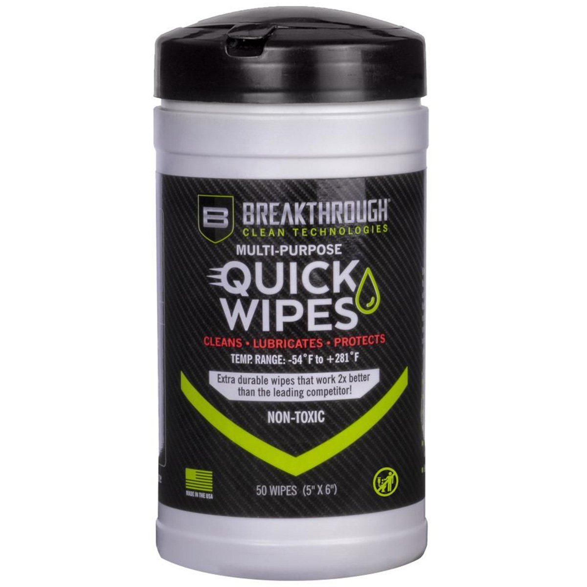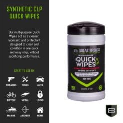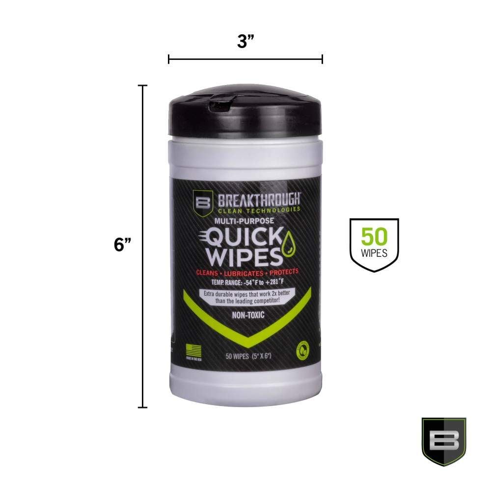 SKU: 22840 Categories: Cleaning / Lubricating Fluid, AR-15 Cleaning Kits, Tools & Cleaning DescriptionThe Breakthrough Clean Multipurpose CLP Gun Cleaning Wipes act as a cleaner, lubricant, and protectant designed to clean and condition in one quick and easy step without sacrificing performance. Formulated from the same chemical platform as our flagship military-grade solvent and high-purity oil, our quick wipes provide exceptional protection across a wide range of temperatures. The extreme-pressure additives in these wipes provide superior resistance against rust and corrosion. These wipes are safe to use on all metal alloys, polymers, and finished stocks.