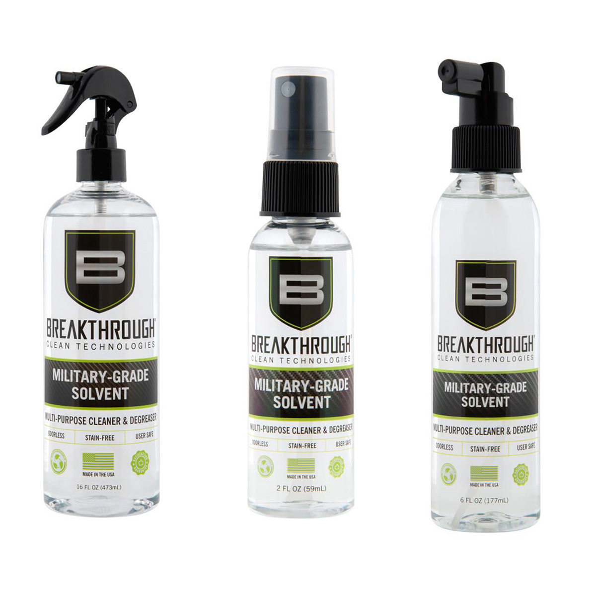 November Savings Sale: use code BFMONTH12OFF for an additional 12% off this item.Our Breakthrough Clean Technologies® Military-Grade Solvent is a user-safe multi-purpose cleaner and degreaser that helps remove oil, grease, and carbon build-up, giving you a no residue clean. Unlike other aromatic cleaners, our odorless formula allows you to clean indoors without having to deal with noxious and unpleasant fumes. Breakthrough Clean Technologies® Military-Grade Solvent cleans quickly and efficiently while reducing the frequency needed between cleanings. It will not stain your wood, plastic, or polymer components and is also safe on Cerakote and hydro-printing. Breakthrough Clean Technologies® Military-Grade Solvent is a benzene-free, HAP-free, state-of-the-art solvent designed to help users break out of the tangle of regulations regarding emissions, disposal, and industrial health hazards. Our Breakthrough Clean Technologies® Military-Grade Solvent is an odorless, low toxicity, high-purity hydrocarbon that exhibits a very low degree of irritancy to the eyes and is non-irritating to the skin. It has a low vapor pressure to control Volatile Organic Compound (VOC) emissions, is non-carcinogenic, and is not regulated under SARA, Title III, Sections 302 or 313, CERCLA, and RCRA requirements. Breakthrough Clean Technologies® Military-Grade Solvent has no listed components and characteristics of hazardous waste per the EPA. Breakthrough Clean Technologies® Military-Grade Solvent has been awarded a complete Toxicity Clearance by the U.S. Army Center for Health Promotion and Preventative Medicine.