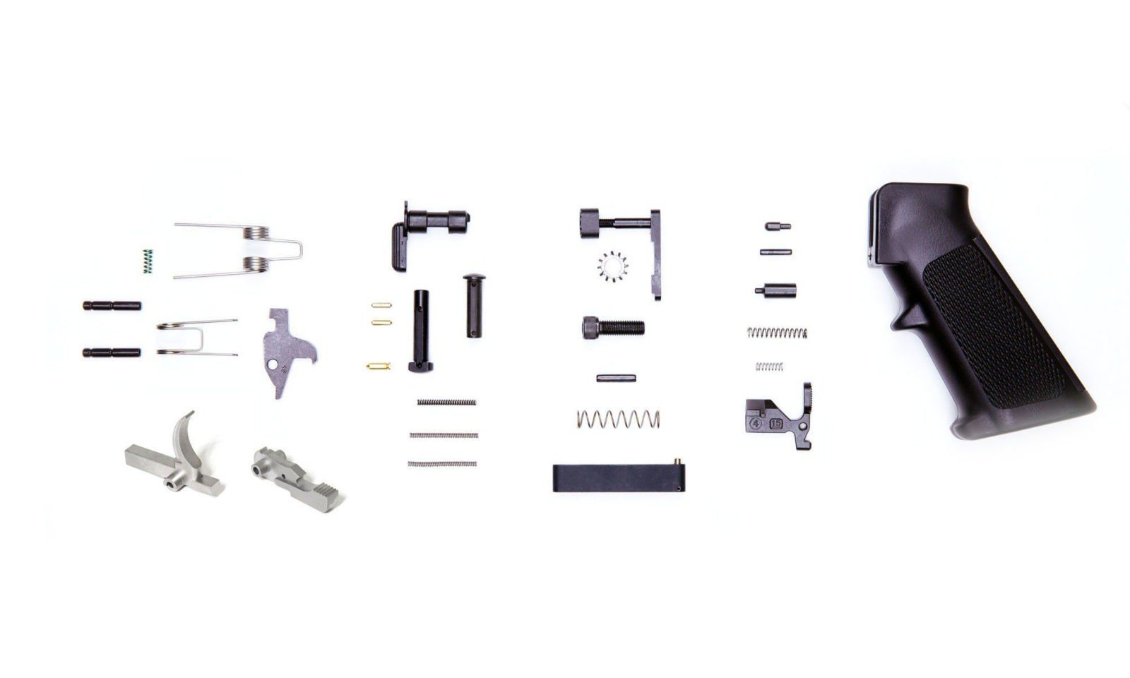 SKU: 1333 Categories: Daily Deals on AR15 Parts, Excluded from Codes, Lower Parts, Lower Parts Kits DescriptionComplete Lower Parts Kit includes, Bolt Catch, Bolt Catch Plunger, Bolt Catch Roll Pin, Bolt Catch spring Buffer, Retainer, Buffer Retainer spring Disconnect, Disconnect spring Hammer (Silver Stainless), Hammer Pin, Hammer spring Magazine Catch, Magazine Catch Button, Magazine Catch spring Pistol Grip (A2 style), Pistol Grip Lock Washer, Pistol Grip Screw, Pivot Pin, Pivot Pin Detent, Pivot Pin Detent spring Selector, Selector Detent, Selector Detent spring Takedown Pin, Takedown Pin Detent, Takedown Pin, Detent spring Trigger (Silver Stainless), Trigger Guard, Trigger Guard Roll Pin, Trigger Pin, Trigger Spring.