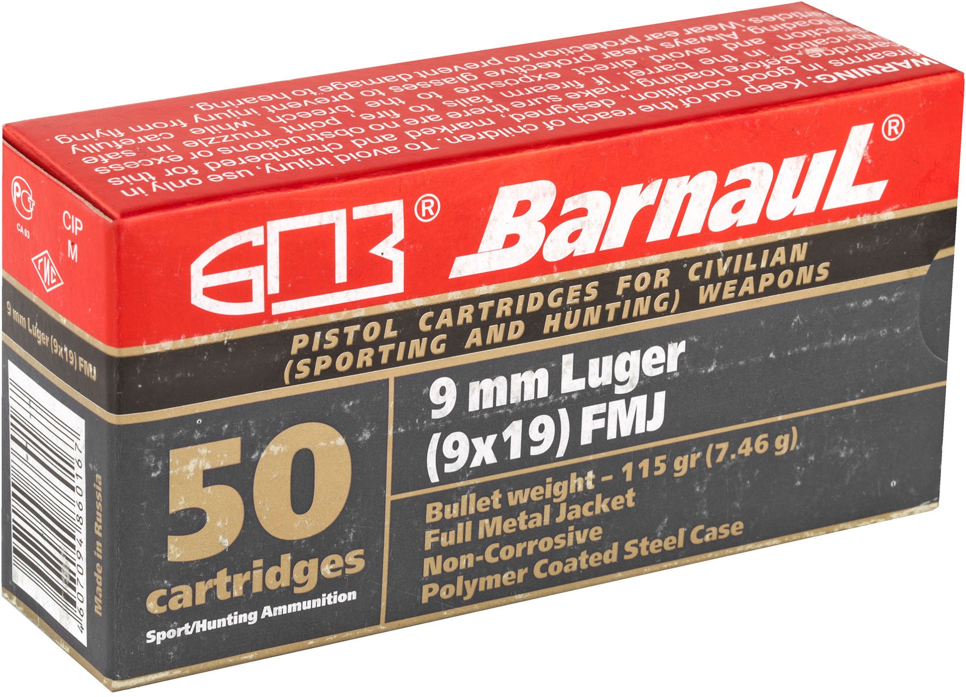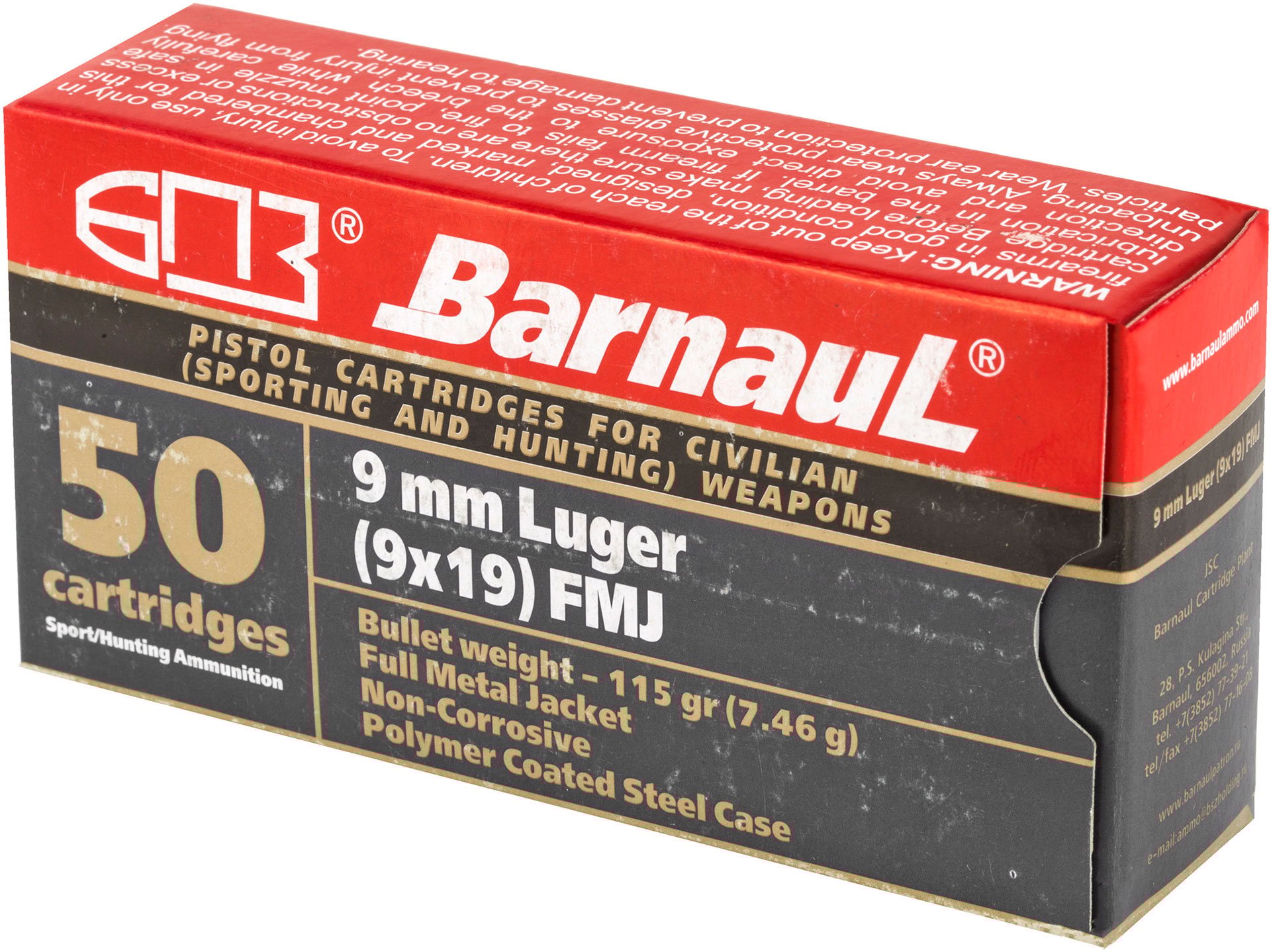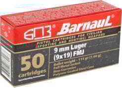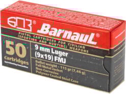 Barnaul Ammunition 9MM 115Gr Full Metal Jacket Steel Polycoated Case Handgun Ammo - 50 Rounds - MKSBRN9MMLUGERFMJ115