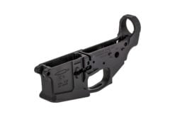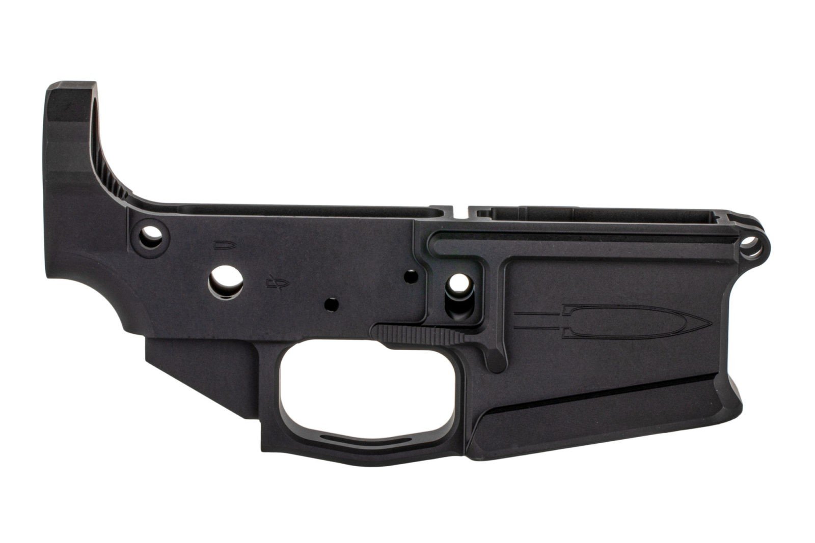 Another feature of this billet AR-15 lower receiver is the rear tensioning screw that takes out any wobble between the upper and lower for better accuracy and a more solid feel. The safety selector pictograph markings are designed for 90° safeties and is compatible with ambidextrous safeties as well as other Mil-Spec and aftermarket components. All components, material, and packaging are made in the United States and the overall weight of this lower is 9.5 ounces.