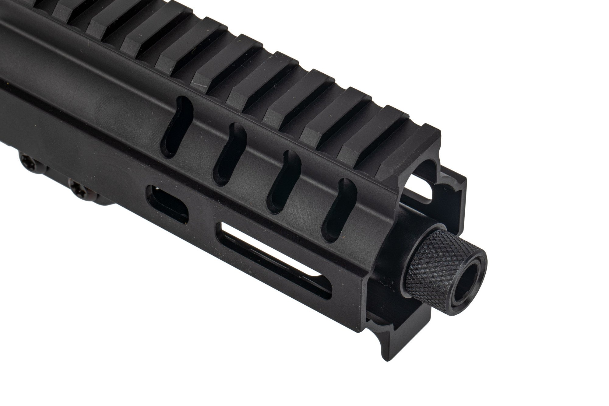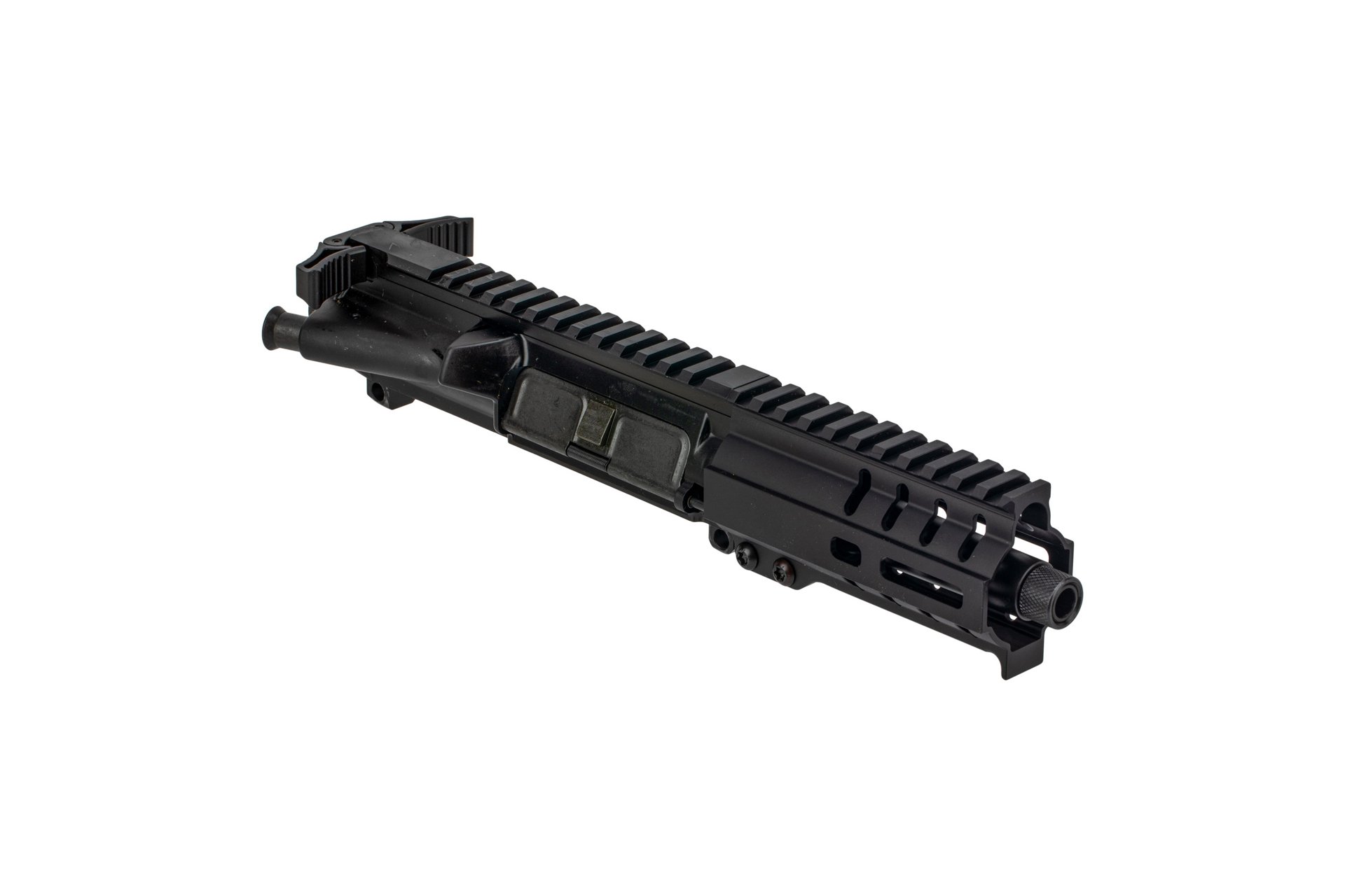 With the CMMG Banshee complete upper, you can now build out the 9mm PCC of your dreams with the highly reliable and soft shooting radial delayed blowback system. Build yourself a compact AR pistol or SBR with the complete 9mm upper with 5” barrel. The 9mm bolt is designed for compatibility with Glock magazines. The bolt resembles an AR-15 pattern BCG with special cuts on the locking lugs that delay the bolt from unlocking improving reliability. Additionally, it allows the whole assembly to be much lighter and reduces the amount of felt recoil. The barrel features a 1/2×28 thread pitch and a salt bath Nitride finish. The upper receiver is forged from 7075-T6 aluminum and the 4” free float handguard features M-LOK attachment slots. The CMMG Banshee 300 Upper Receiver also comes with an ambidextrous charging handle.