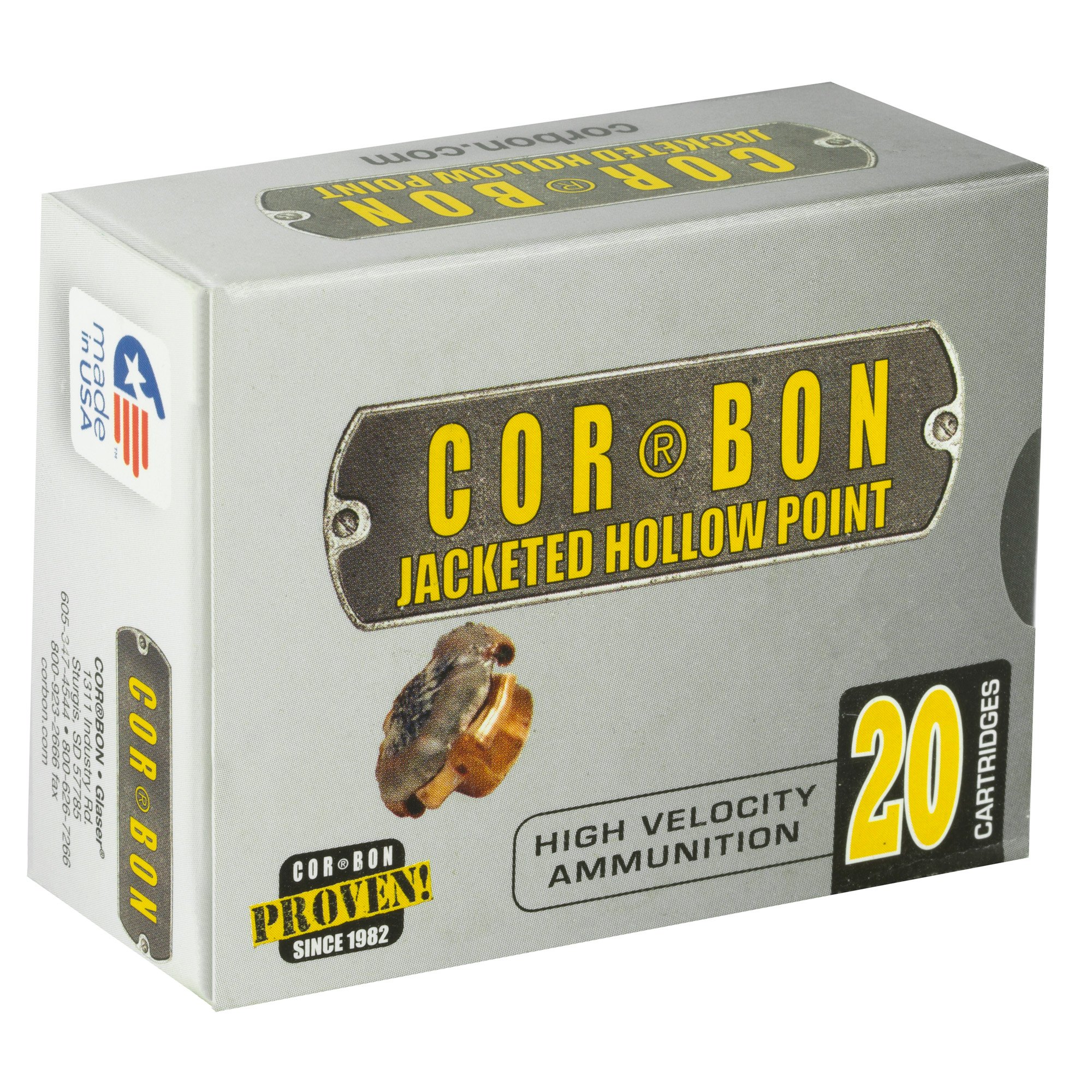 COR(R)BON JHP(TM) is the traditional hollow point that put COR(R)BON on the map. JHP(TM) is proven ammunition that provides reliable penetration and expansion. The internal and external serrations and soft lead cavity provide stopping power and an average penetration of 9 to 15 inches in ballistic gelatin.