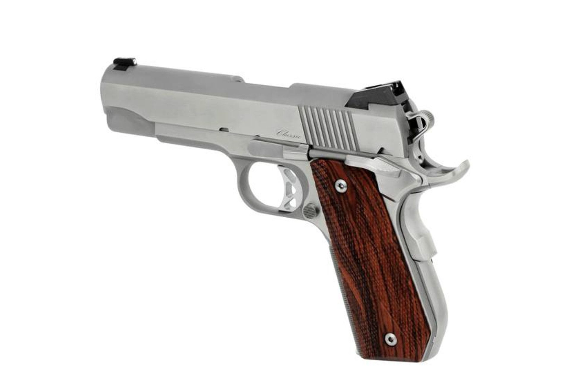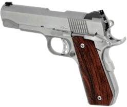 The Dan Wesson Commander Classic Bobtail is a 4.25 series 70 style, commander sized 1911 featuring a stainless steel frame and forged stainless steel slide. Like all Dan Wesson 1911s, Commander Classic models incorporate top quality parts from the best names in the industry Round top slide with fixed 3 dot tritium night sights. It has a forged, one piece match grade barrel and bushing, Ed Brown Bobtail mainspring housing, 20 LPI checkered front strap, hand polished flat surfaces with contrasting bead blasted rounds, beveled magwell, lowered and flared ejection port, Ed Brown memory groove grip safety, Ed Brown slide stop, tactical, extended thumb safety, Commander-style match hammer, match grade sear, aluminum trigger with stainless bow, a tuned, machined, internal extractor, and an extended serrated magazine catch. Wolff springs used exclusively. All sharp edges dehorned by hand. It is finished with a set of diamond checkered cocobolo grips.