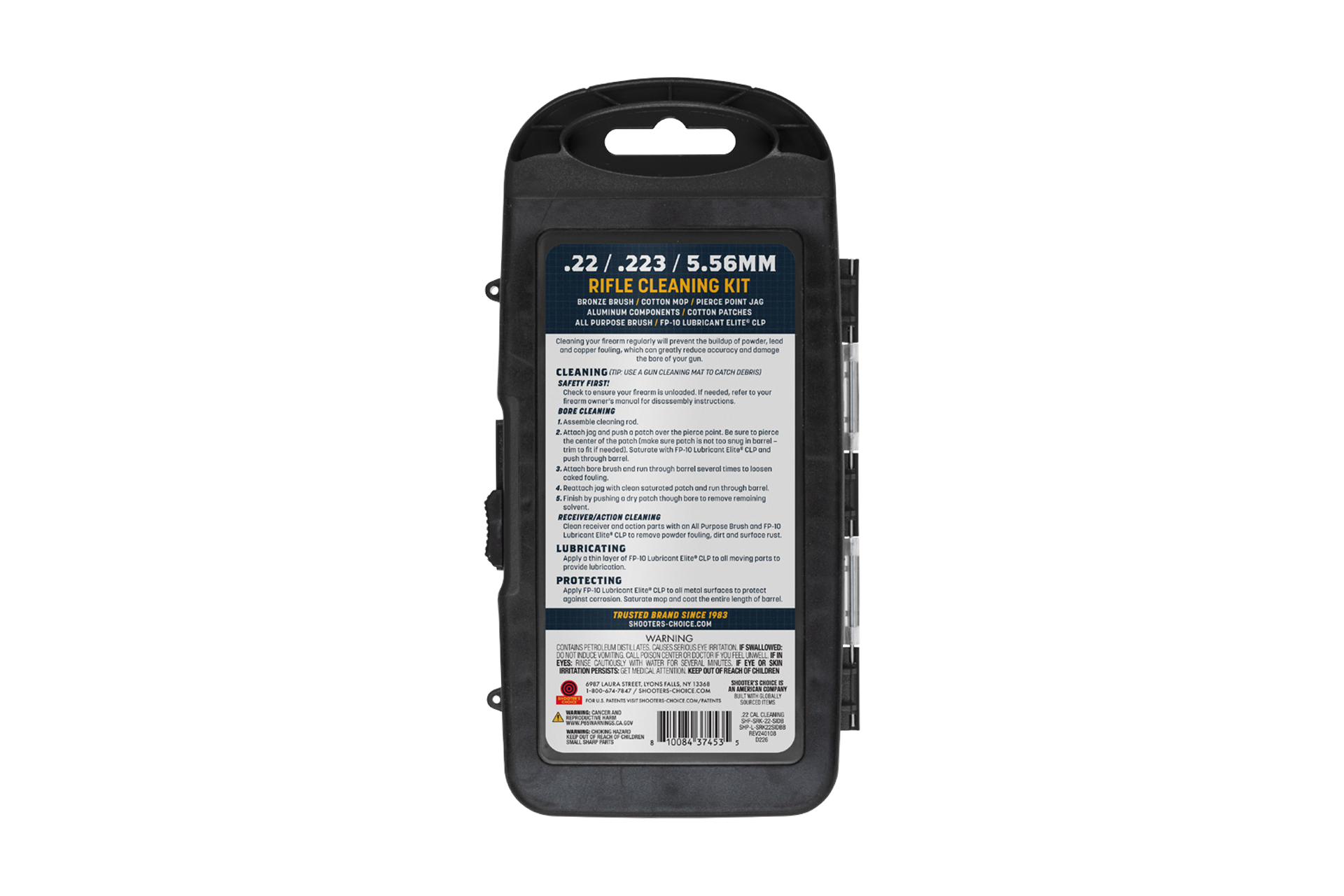Dirty Bird’s .22 cal Rifle Cleaning Kit contains quality components that won’t damage your firearm while cleaning. Get everything you need to clean your .22cal/.223cal rifle in one place with this gun cleaning kit. Includes aluminum rod set with swivel t-handle along with a brush, mop, jag, slotted tip, bore guide and patches. An all purpose brush and bottle of FP-10 Lubricant Elite® CLP is also included to keep your firearm properly lubricated and operating smoothly.
