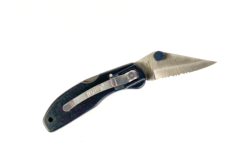 Nylon handle folding knife, 420A stainless steel blade, lockback design, metal pocket clip, ambidextrous thumb stud.