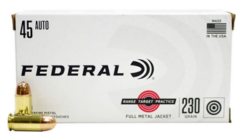 Federal Range Target 45 ACP 230 grain FMJ ammo for sale delivers a hard-hitting, accurate target shooting experience. Available in a 50 round box, this made in USA full metal jacket cartridge delivers 890 fps of muzzle velocity and runs clean through the bore, resulting in consistent accuracy from the first round to the last. When sighting in your pistol, or engaging in a vigorous training session, Federal Range Target .45 230gr ammunition has the peak performance you need to accomplish your shooting goals.