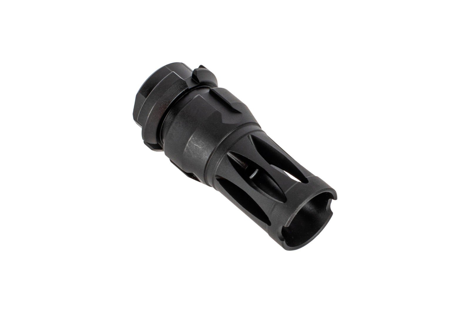 The effective design of the 6315 draws inspiration from the muzzle device found on Stoner 63 -itself an improvement on the A2 flash hider – but modernized and tweaked for superior performance. By shortening and narrowing the side ports, muzzle rise reduction has improved and the increased real estate at the muzzle end has allowed the inclusion of wire cutter notches at 3 and 9 o’clock positions. The impressive suppression capabilities combined with the lightweight and small design are proof that larger muzzle devices aren’t necessarily better. Simple, clean, and effective, the 6315 is an excellent option for your next AR-15 build.