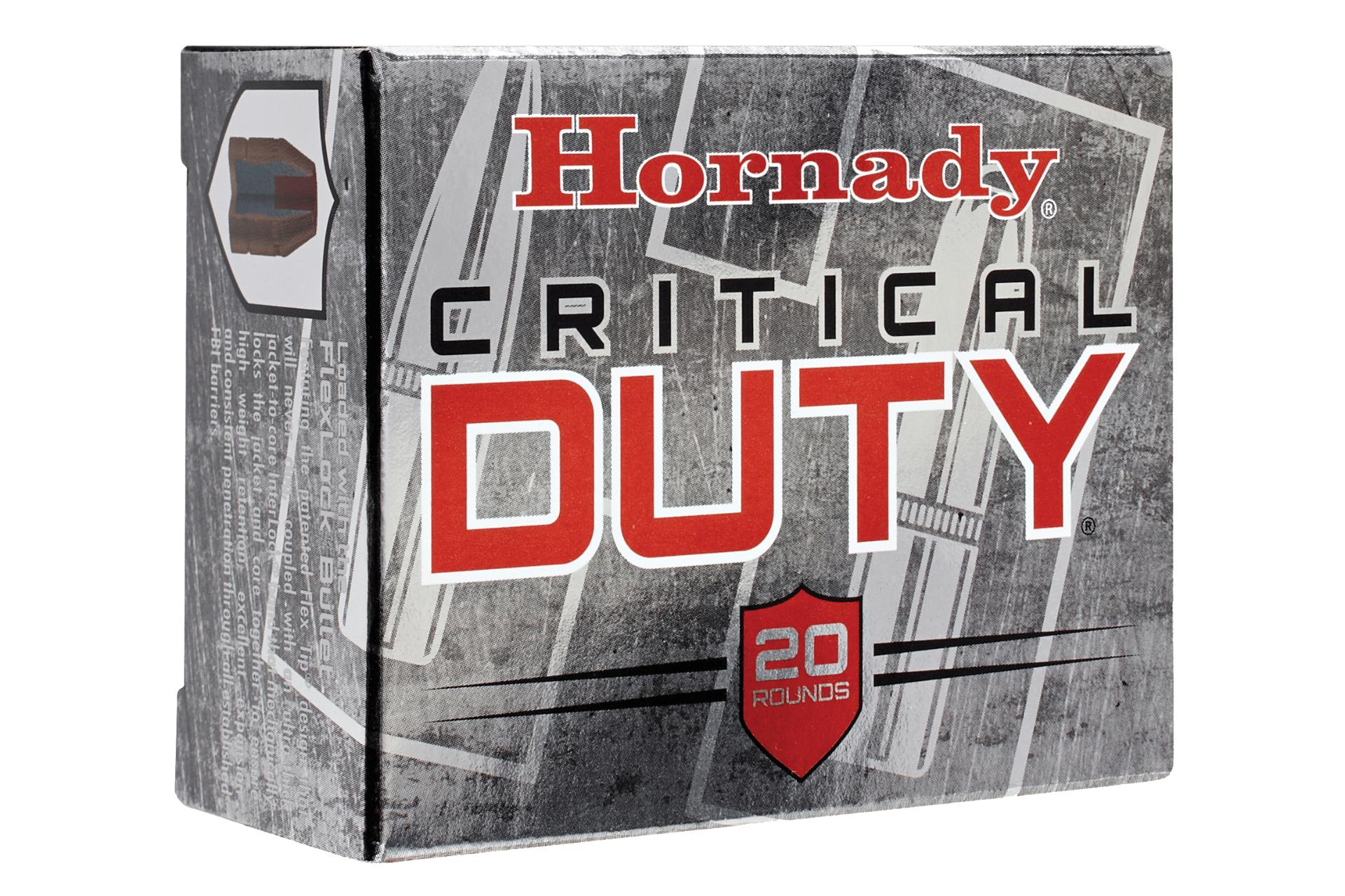 Hornady’s critical duty load is designed to meet the needs of those who demand superior barrier penetration and prefer a full-size handgun for their personal protection. Bright nickel-plated cases simplify chamber checks in reduced light. Additionally, all critical duty ammunition is loaded with low flash propellant to help preserve night vision in low-light firing. The flexlock bullet incorporates two revolutionary hornady features to deliver superior barrier penetration and consistent performance. A large mechanical jacket-to-core interlock band works to keep the bullet and core from separating for maximum weight retention, while the flex tip eliminates clogging and aids bullet expansion. The core is made of high-antimony lead making it extremely tough, delivering controlled expansion for unparalleled terminal performance consistency and is more economical than similar bonded bullets.