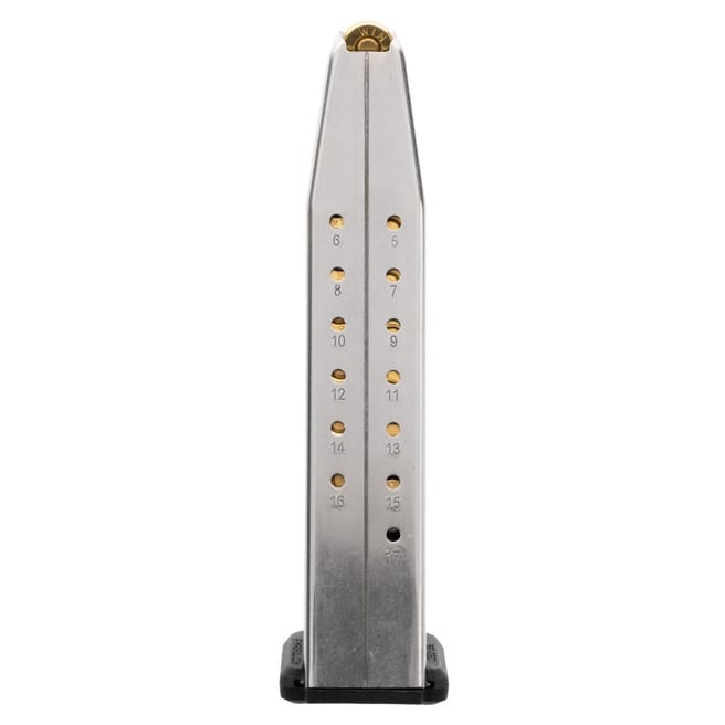 The Magpul AMAG 17 SG9 SIG P320 9mm Magazine is a reliable magazine solution for SIG P320 users. This 17-round capacity magazine is constructed with a heat-treated, stainless-steel alloy body, providing durability and corrosion resistance. The stainless-steel spring enhances longevity, paired with a polymer floorplate and follower maximum reliability. This magazine also features a high-visibility, controlled-tilt follower, a flared floorplate that simplifies cleaning, and a paint-pen dot matrix for convenient magazine marking. The capacity-indicator windows, starting at five rounds and incrementing along the spine, provide quick reference during use. The AMAG 17 SG9 embodies Magpul’s is made in the United States of America.