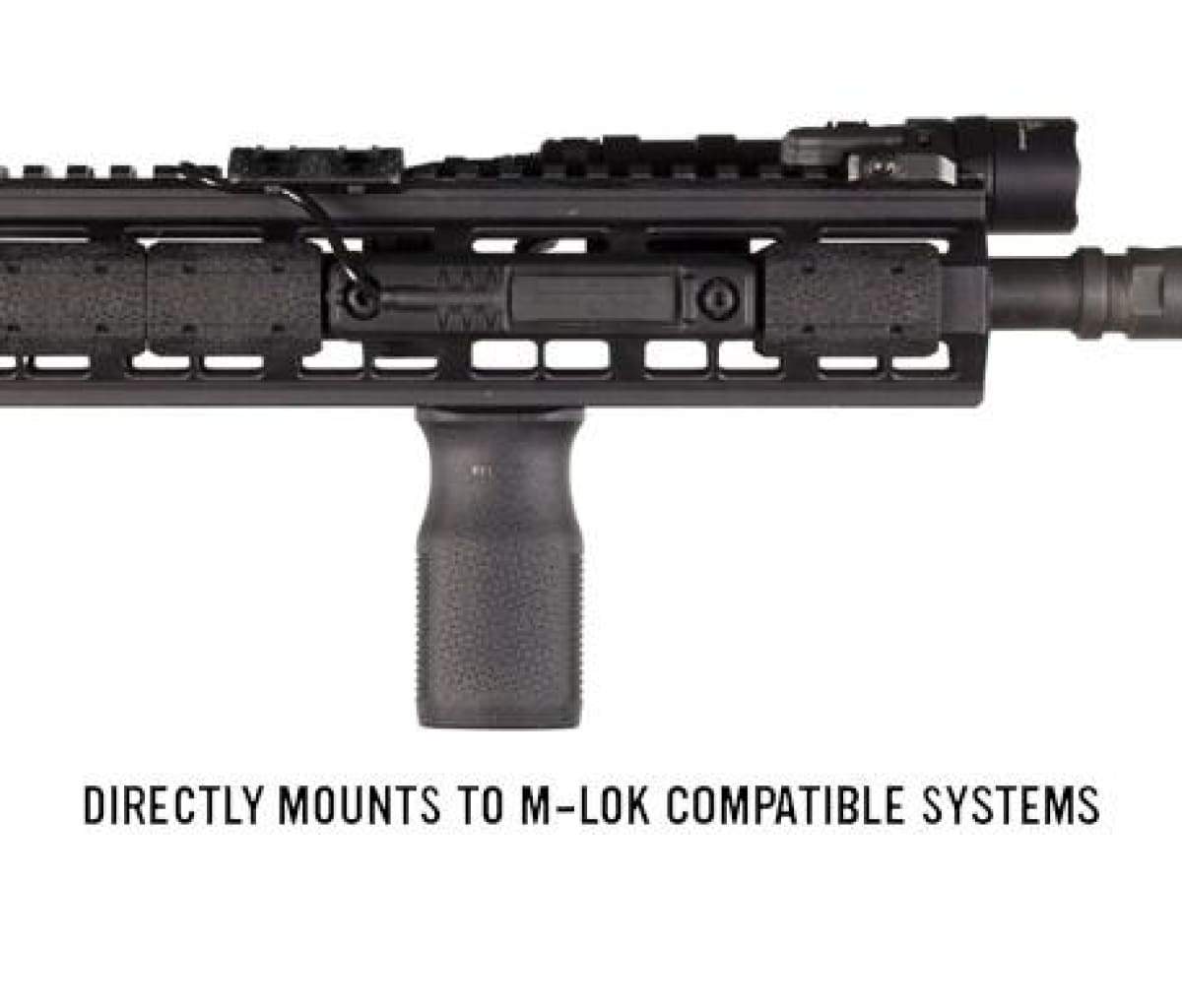 With rounded contours and a shorter length, it has been optimized for use with the “thumb break method” of shooting and can also be used as a traditional vertical foregrip. All hardware necessary for attachment directly to M-LOK Slots on either aluminum or polymer hand guards and forends is included.