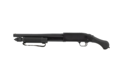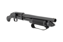 The Mossberg 590 Shockwave is a reliable and highly functional shotgun, perfect for home defense. It features a 14-inch steel barrel and a single brass bead sight. This 12-guage, 6-shot firearm can be easily manipulated with a single hand. It features a Shockwave Raptor Grip to fit most shooters hands, limit recoil and create a reliable hand/gun connection. The 590 Shockwave’s design is based upon Mossberg’s proven pump action design ensuring optimal performance when it counts. This model features a saddle with a Crimson Trace Laser for a serious upgrade in aiming performance. The 590 boasts a durable aluminum receiver with a black anodized finish for a long service life and an aesthetically pleasing matte black barrel and magazine tube. The 590 Shockwave’s functionality is evident with a heavy walled barrel for strength, non-binding twin action bars for reliability, positive steel to steel lock-up for performance, an anti-jam elevator and dual extractors for consistent cycling and an ambidextrous top-mounted safety. If you are looking for an easily manipulated 12 gauge for home defense or maybe you just think it looks cool, check out the Mossberg 590 Shockwave.