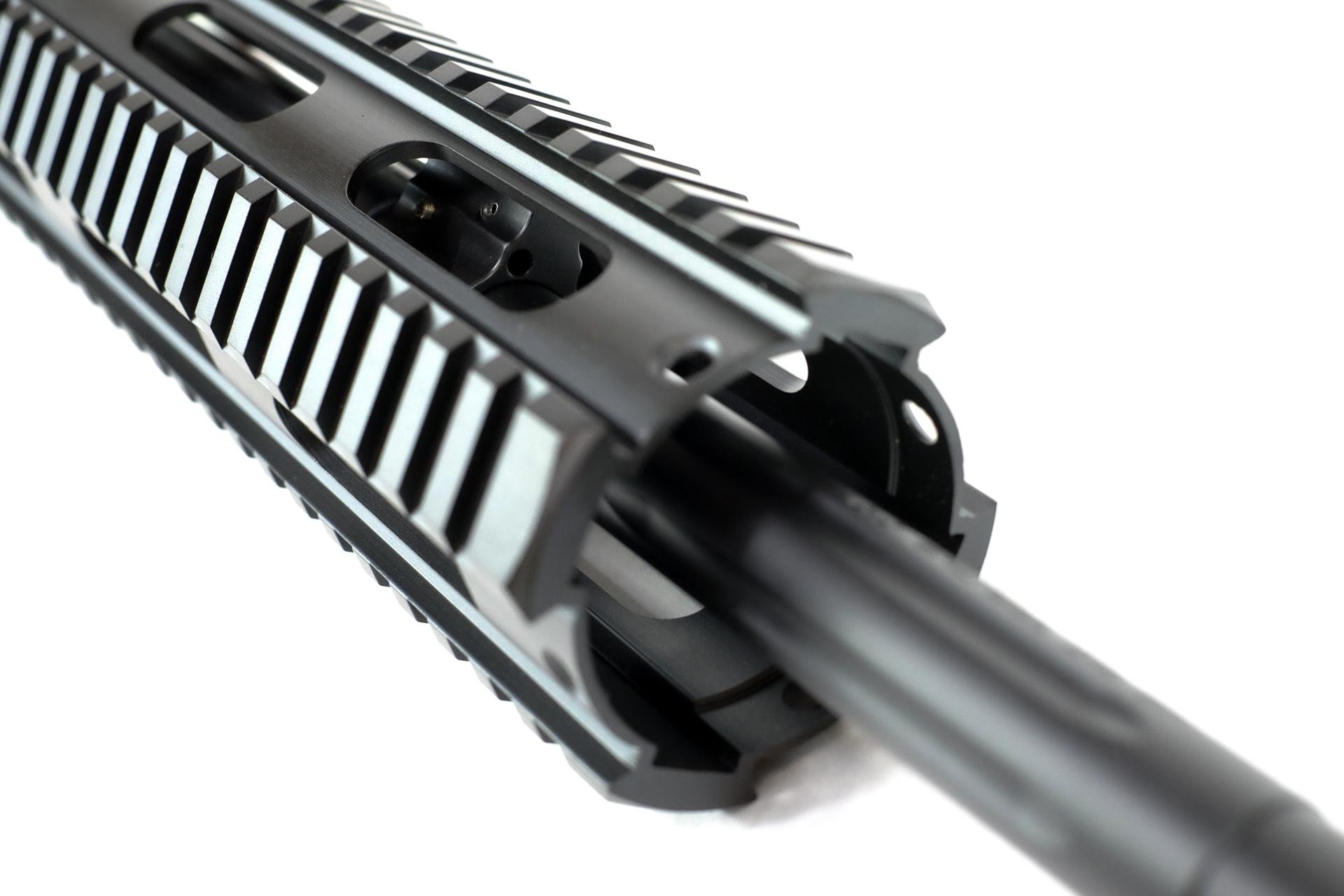As always we’re using solid components, like a QPQ Nitride tunable gas block and a stainless steel gas tube, finished off with a Jet Black A2 style muzzle device. The finish on this A2 is much better than the parkerizing of most other A2s and looks outstanding paired with the QPQ Nitride Barrel. We also assemble each upper according to strict standards. This includes dimpling the barrel, using semi-permanent thread locker on the proper components and anti-seize grease on the properly torqued barrel nut and muzzle device.