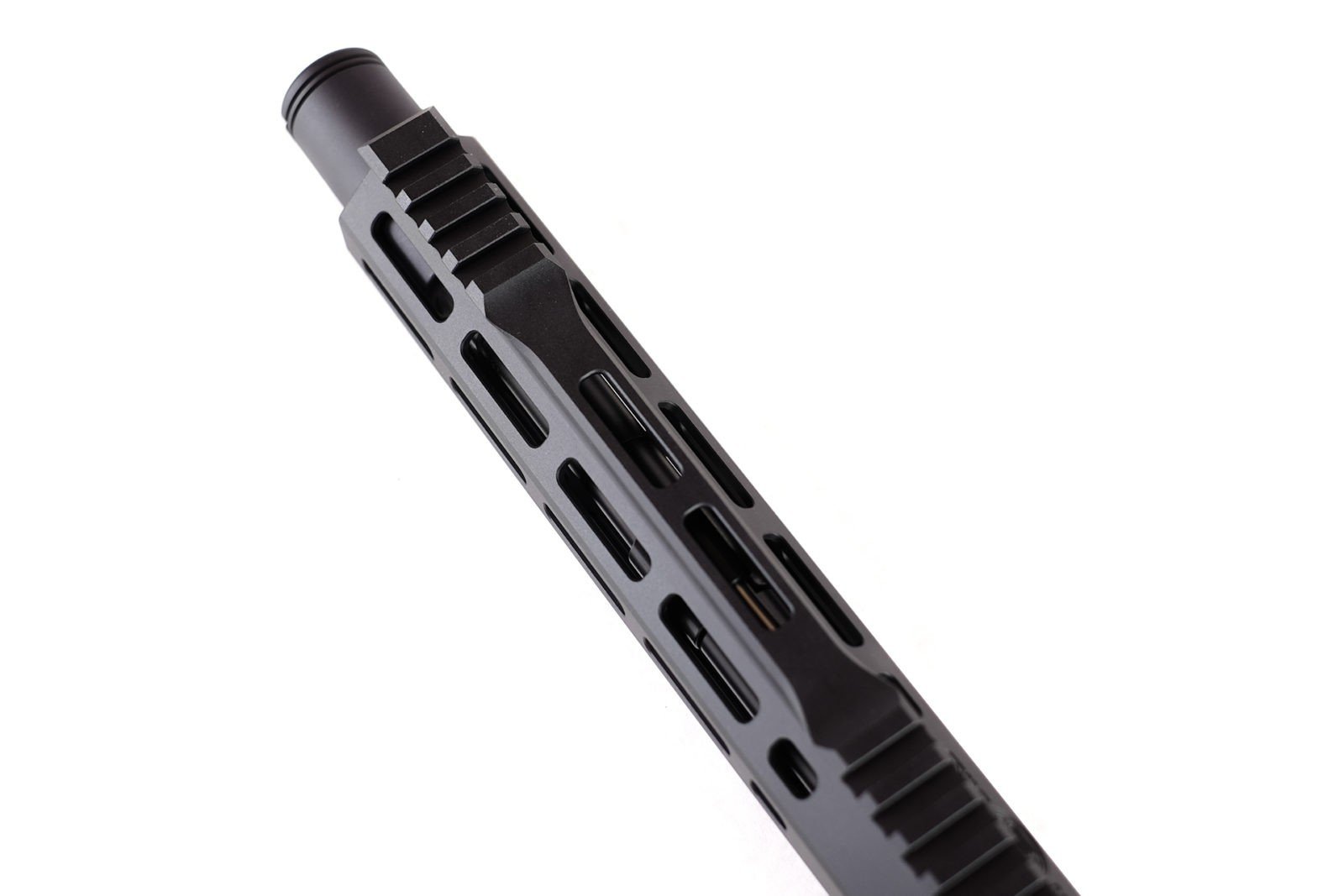 - M-LOK attachment slots on all sides, including the shaved portion of the top rail.