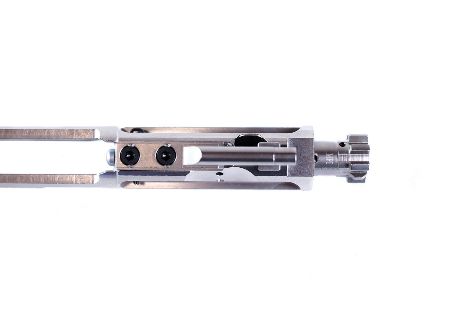 The carrier is made from 8620 tool steel and is paired with a 9310 steel bolt. The carrier and bolt are then treated with a nickel boron finish to ensure longevity, increase lubricity and make cleaning a breeze.