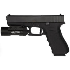 SKU: 23150 Category: Weapon Lights DescriptionThe TWM-350 Full Size Weapon-Mounted Light uses an LED rated at 350 lumens working in conjunction with a high-efficiency deep parabolic reflector to create a usable beam of light rated at 215 meters. This weapon light features a unique and completely ambidextrous toggle switch on each side of the light to operate the momentary-on and constant-on lighting modes. The housing of the TWM-350 is constructed from aircraft-grade 6061-T6 aluminum with a glass-filled nylon polymer battery door and toggle switch. Power comes from two included CR123 batteries. (Not compatible with rechargeable batteries.)