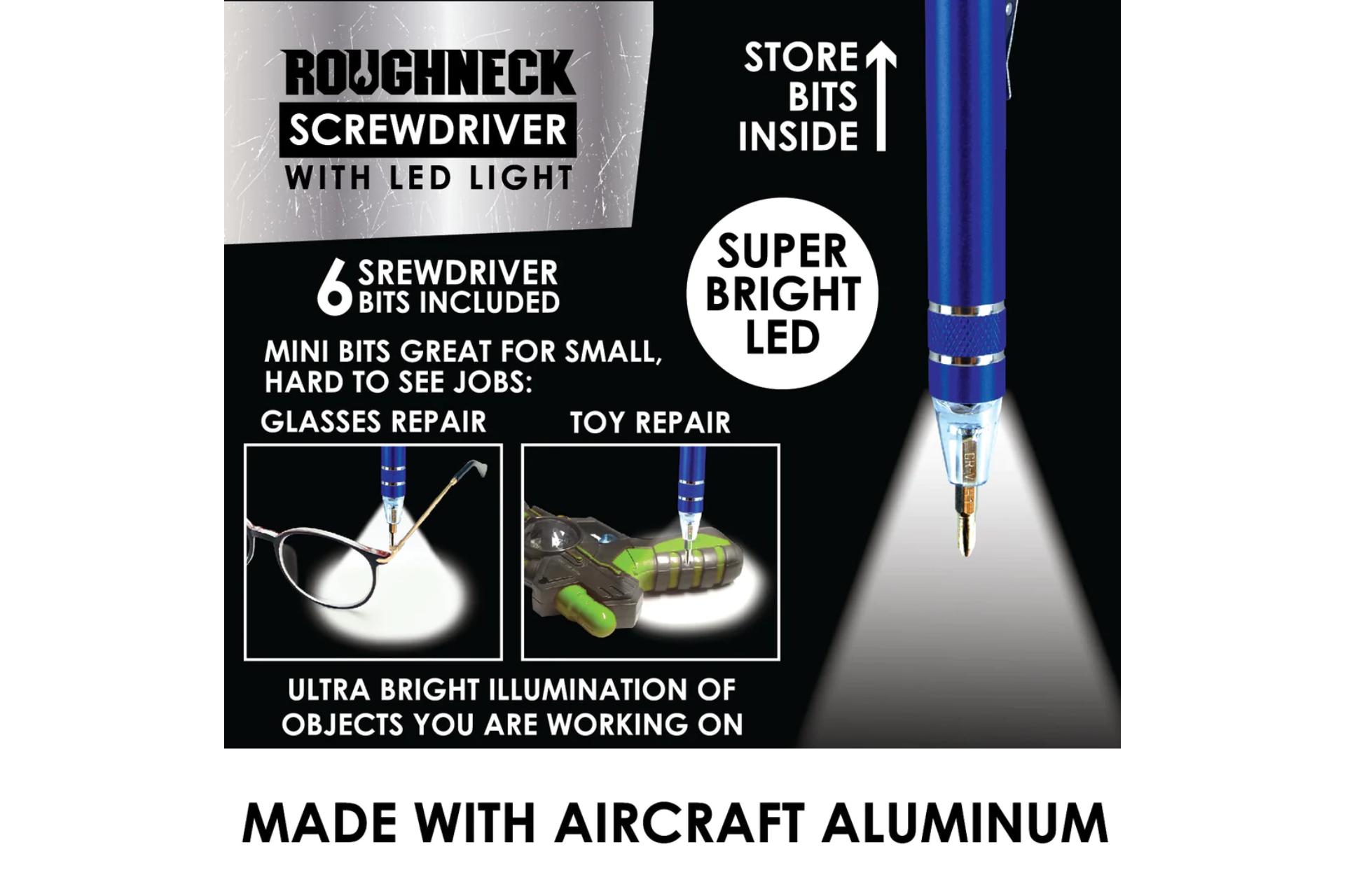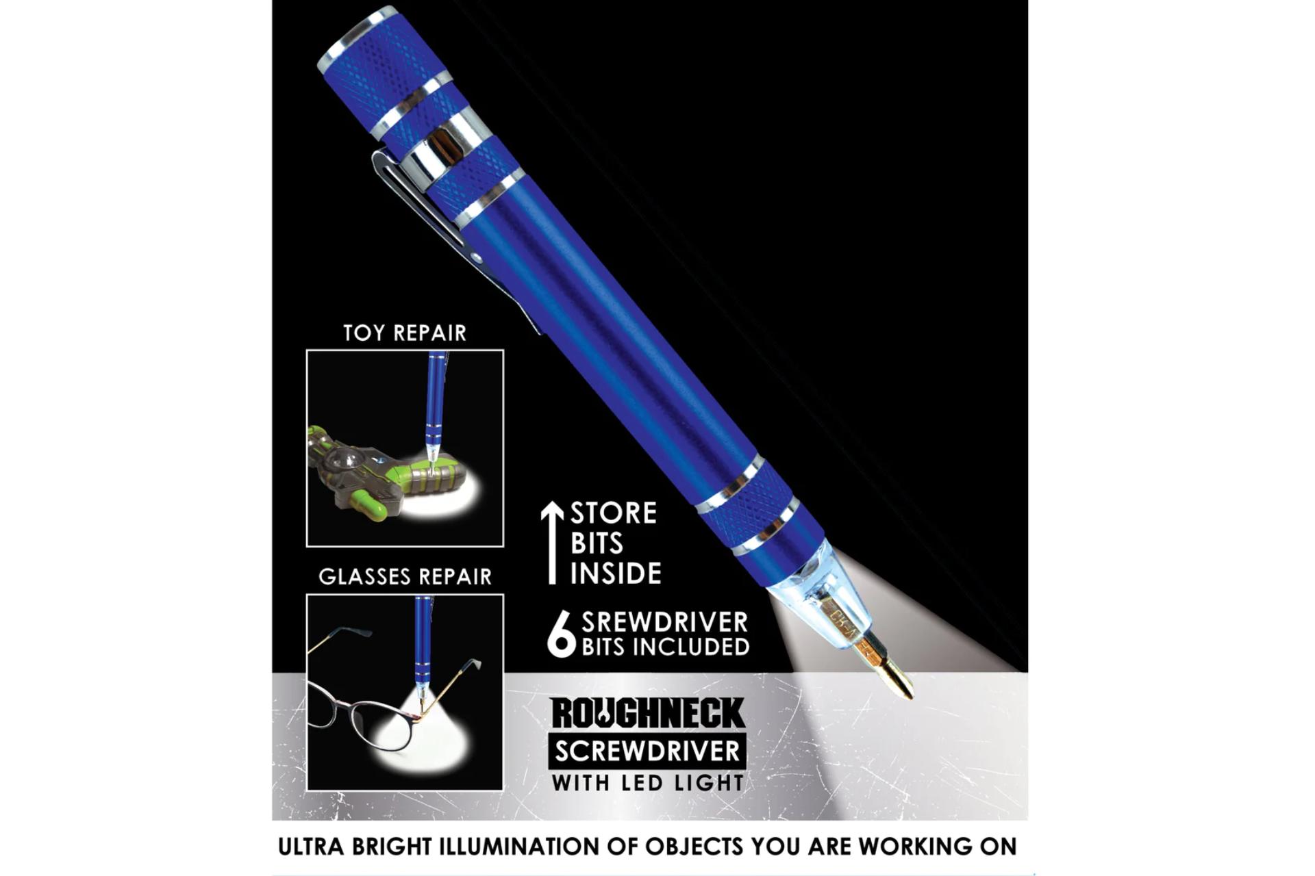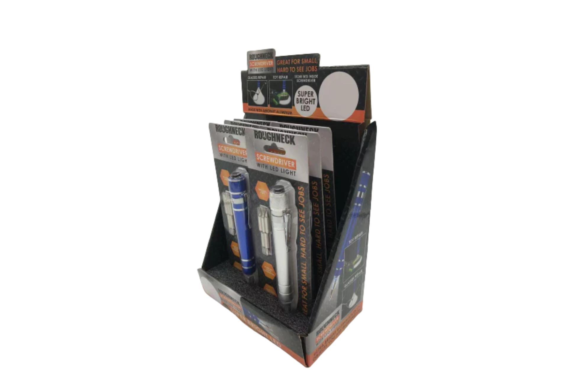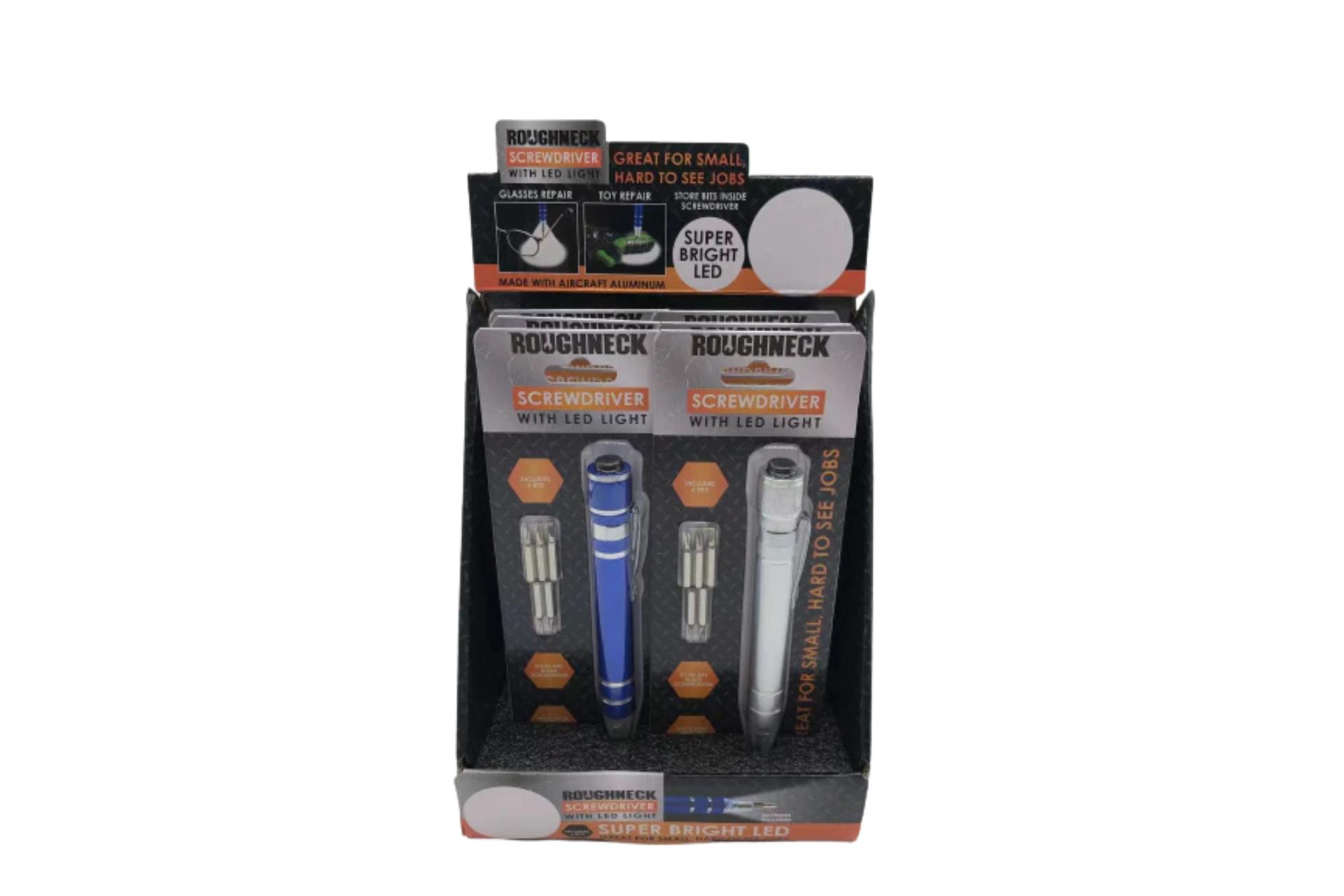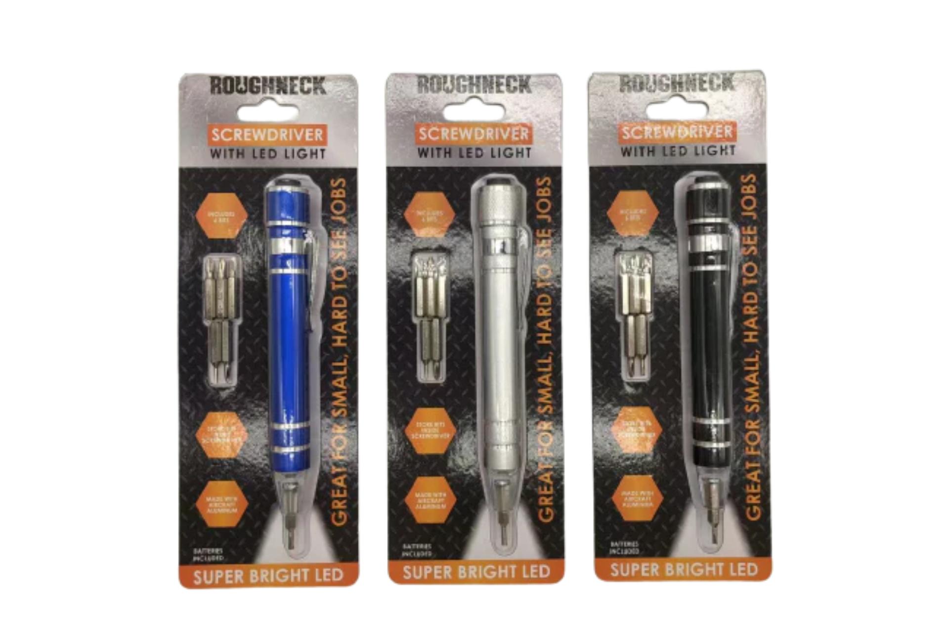 Roughneck LED Screwdriver Tool is a must-have for those tiny fixes! Each tool features ultra bright illumination for viewing objects you’re working on. Six screwdriver bits included, and can be stored inside! Each display includes a variety of black, blue and silver.