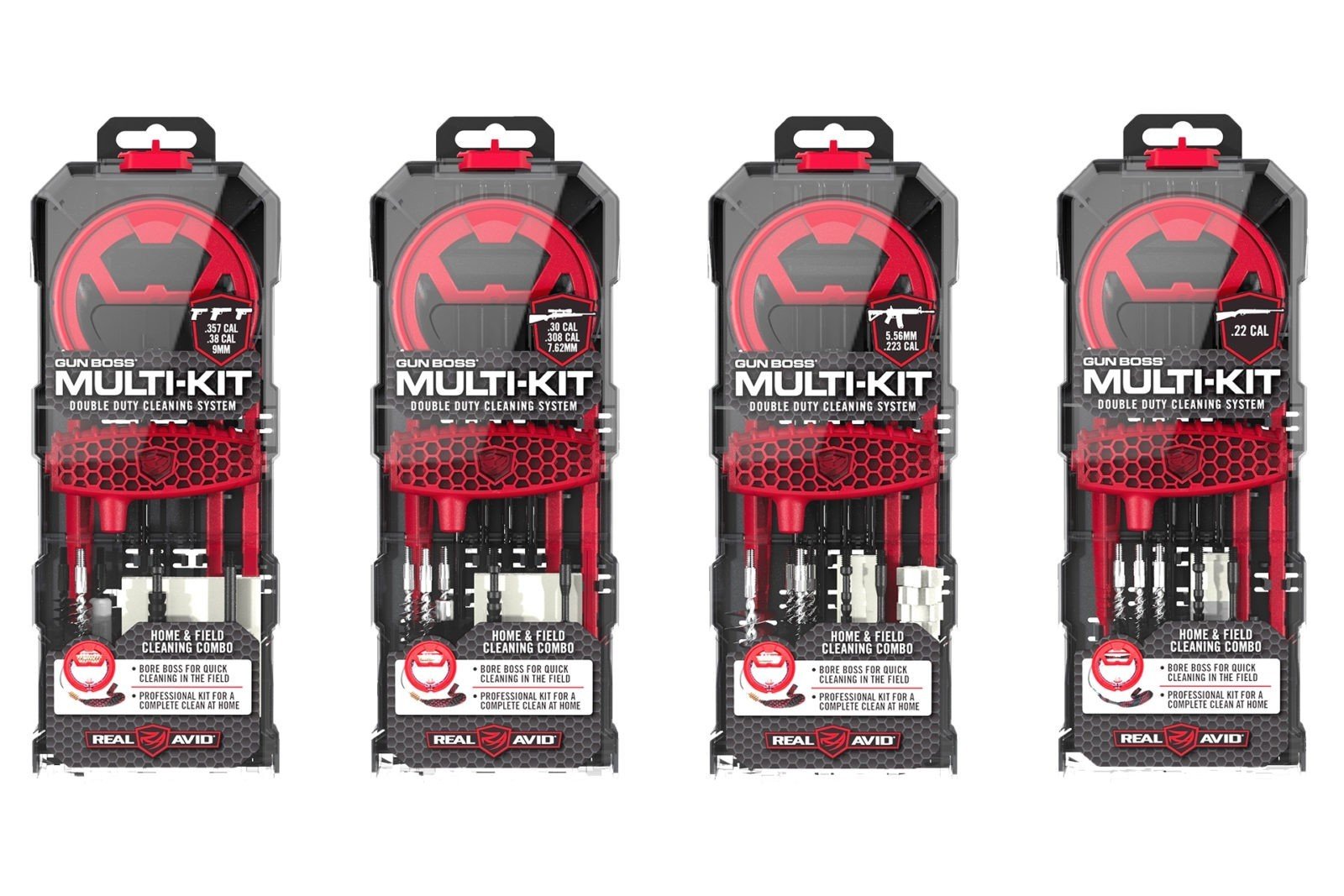 Home and field double duty, single caliber specialized gun cleaning kits. Kits include the Bore Boss for a quick clean any time you shoot your gun and an expanded gun cleaning kit with all the tools you need to fully clean bore, action and chamber.