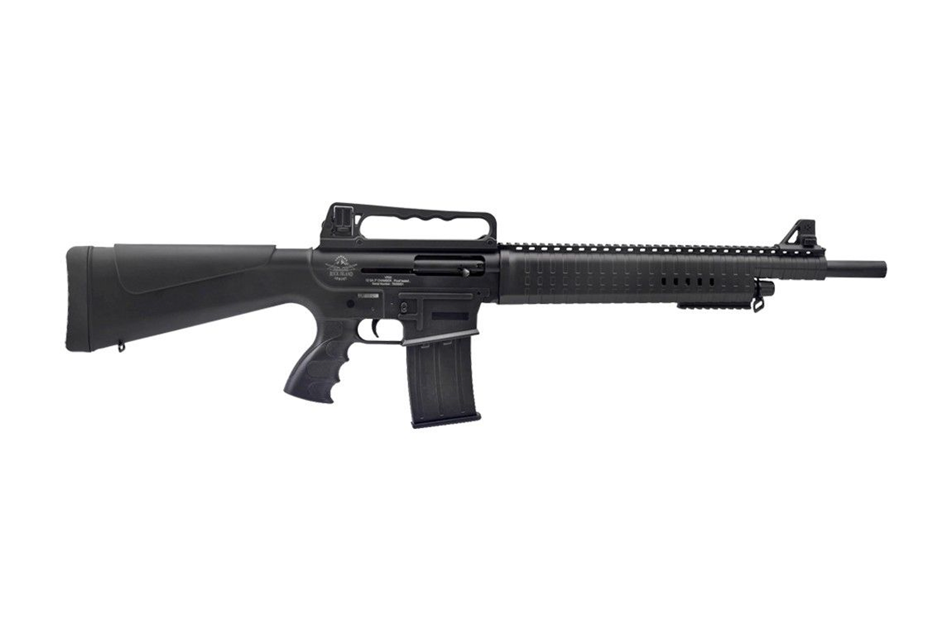 The ultimate design and features of an AR semi-automatic shotgun using a conventional gas-operated action which is located around the support tube that runs below the barrel. The return spring is also located around the same support tube which is concealed by an enlarged polymer handguard. The barrel can be very easily removed from the upper receiver. The upper receiver is manufactured from an aluminum alloy. The magazine release button mimics the M16 rifle location. The manual safety also duplicates the M16 style being located on the left side of the receiver above the pistol grip. The top of the receiver has a carrying handle and integral picatinny rail for mounting rear sights, or any optical accessories. The VR60 12-gauge shotgun is appropriate for all levels of hunting and sporting enthusiasts. Comes packaged in a nice commercial box with the chokes and magazine. Removable A-2 style carry handle allows for quick conversion to a flat top. Chambered for 3″ Magnum loads.