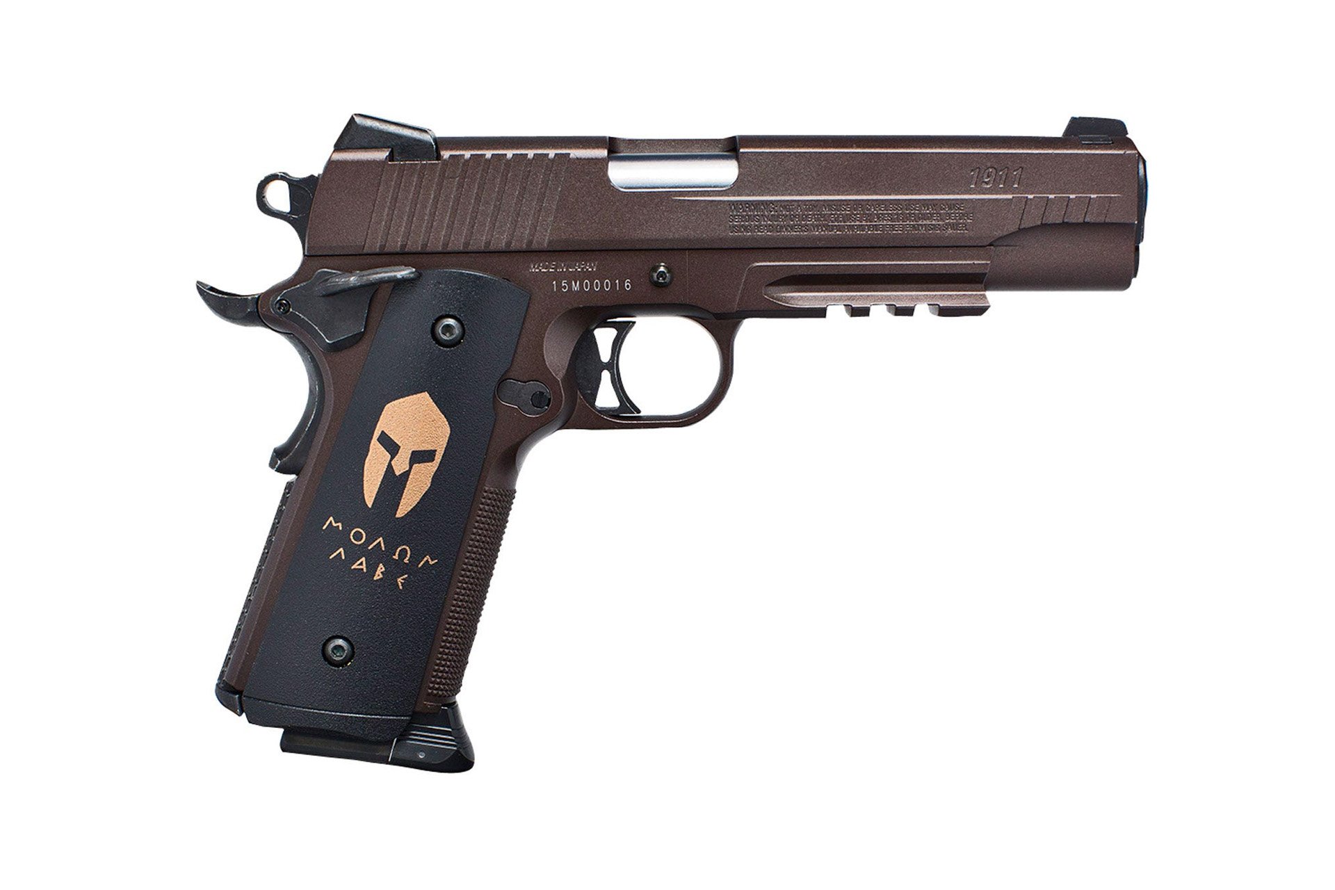Sig’s 1911 Spartan BB airgun features an engraved Molon Labe logo on the slide, custom Spartan grips, bronze full blowback slide and frame, and a skeletonized trigger. This model also has a grip safety and a cam lever Co2 loading port.