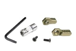 Our ambidextrous safety selector is a superior drop-in replacement for all mil-spec safeties (AR platform 5.56 & 7.62) and is meticulously machined from the finest materials to provide the smoothest operation and a crisp positive feedback. The levers are machined from 7075 aluminum and are hard coat anodize (available in 4 different colors) after a heavy acid etch process which dulls the machined surface and provides a superior protective finish. The core or shaft is a hardened 416 stainless steel which is highly corrosion resistant and very strong. Our unique lobular interface between the lever and the shaft provides a solid connection and allows the lever to be installed in 6 different positions (not just two like other safeties) for the the ultimate experience in user customization. The engraved markings on the shaft simplify the installation of the 60 or 90 degree throw options. Quality USA made wrench included.