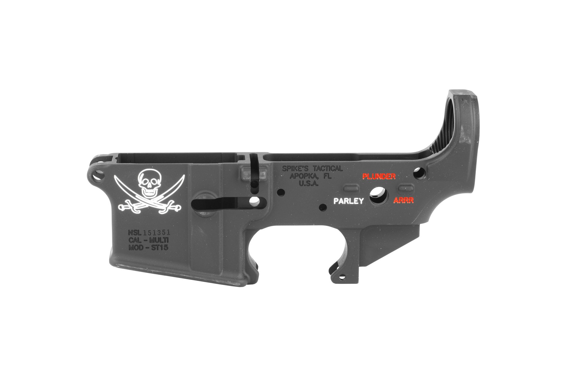 The Spike’s Tactical Calico Jack Lower is a special series lower receiver featuring a skull with crossed swords prominently on the left side of the magwell. Spike’s Tactical stripped lowers are made to the highest standards. If you are planning a build or just putting lowers away for a rainy day, you can’t go wrong with Spike’s lower receivers.