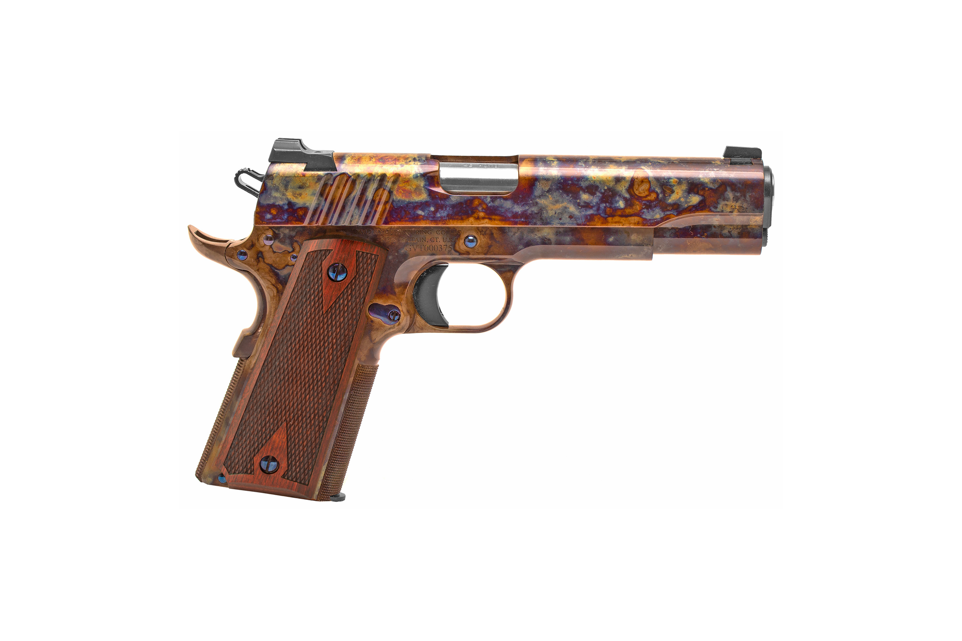 Standard Manufacturing is very proud to introduce a 1911 that has been hailed as the pinnacle of the art of gun-making. Expert craftsman have performed many labor intensive steps including hours of hand polishing and stoning in order to present you with a masterpiece. This particular model features a high polished case colored finish with a gorgeous set of rosewood double diamond grips. All of the metal to metal fits are as perfect as can be and were performed by a very skilled gunsmith. The standard Manufacturing 1911 is a generational piece that will easily earn it’s place as a gem in your collection.