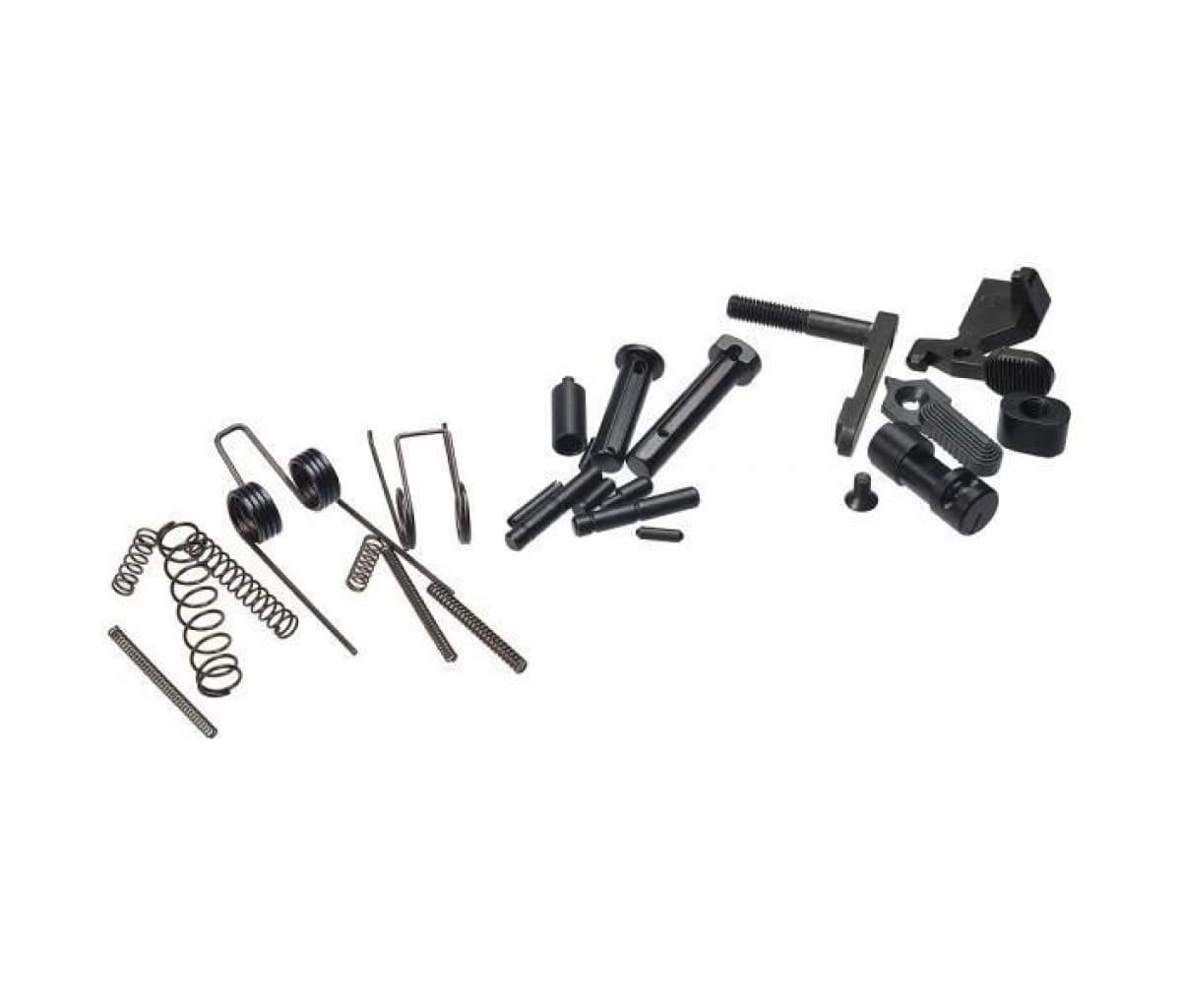 SKU: 1359 Categories: Lower Parts, Lower Parts Kits DescriptionThis lower parts kit comes with the basic necessities to complete a lower receiver and is assembled for those who already have an aftermarket trigger group, grip and trigger guard. Every part is cast and machined to MILSPEC standards. Note: Magazine catch thread is metric and will not work with California Compliant Bullet Button or other third party mag release buttons Package Includes: 1x Pivot Pin 1x Hex Selector 1x Bolt Catch Spring 2x Detent Spring 1x Bolt Catch Buffer 2xTake Down Detent 1x Bolt Catch 1x Magazine Catch Spring 1x Bolt Catch Roll Pin 1x Magazine Catch Button 1x Magazine Catch 1x Selector Spring 1x Selector Detent 1x Take Down Pin 1x Buffer Retainer 1x Buffer Retainer Spring 2x Trigger Pins 1x Disconnector Spring 1x Hammer Spring 1x Trigger Spring