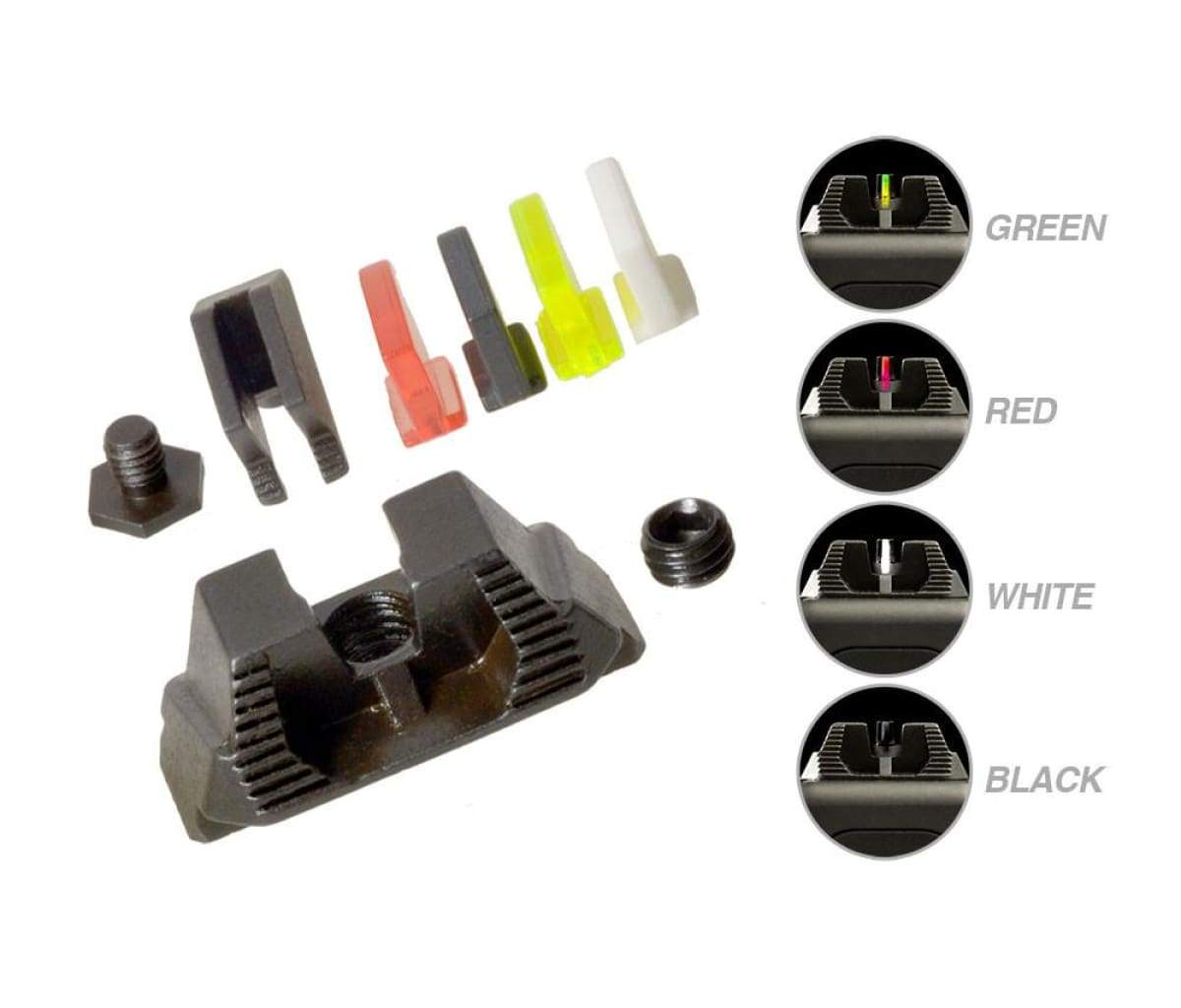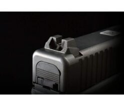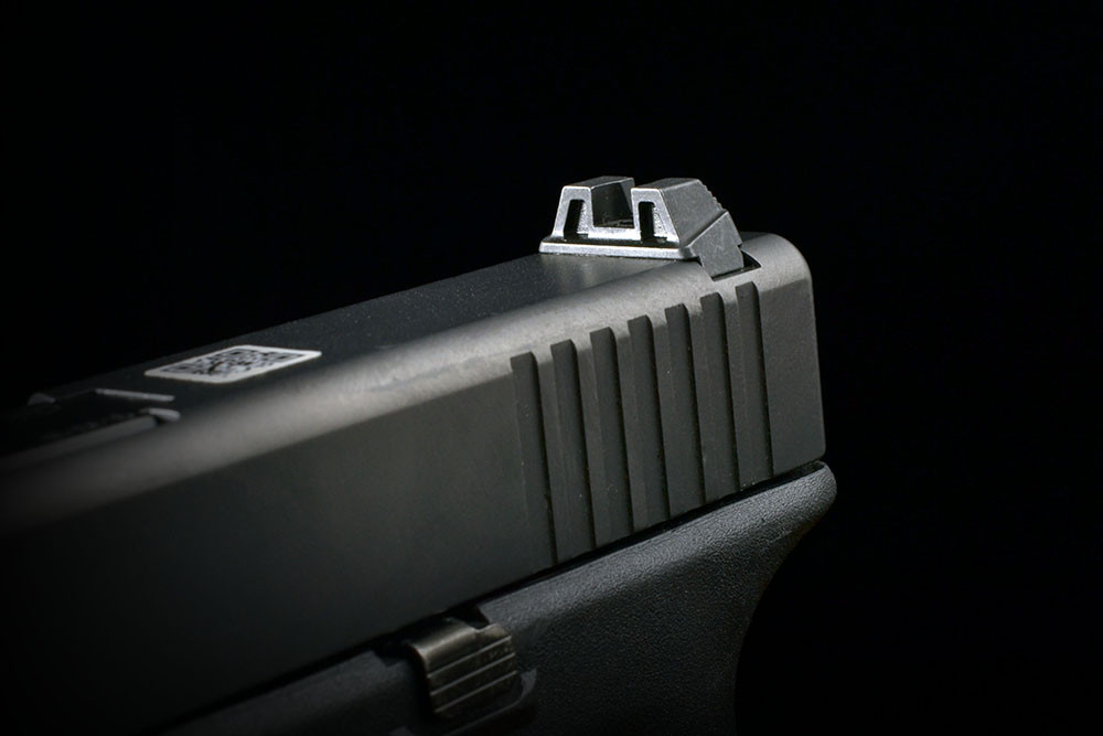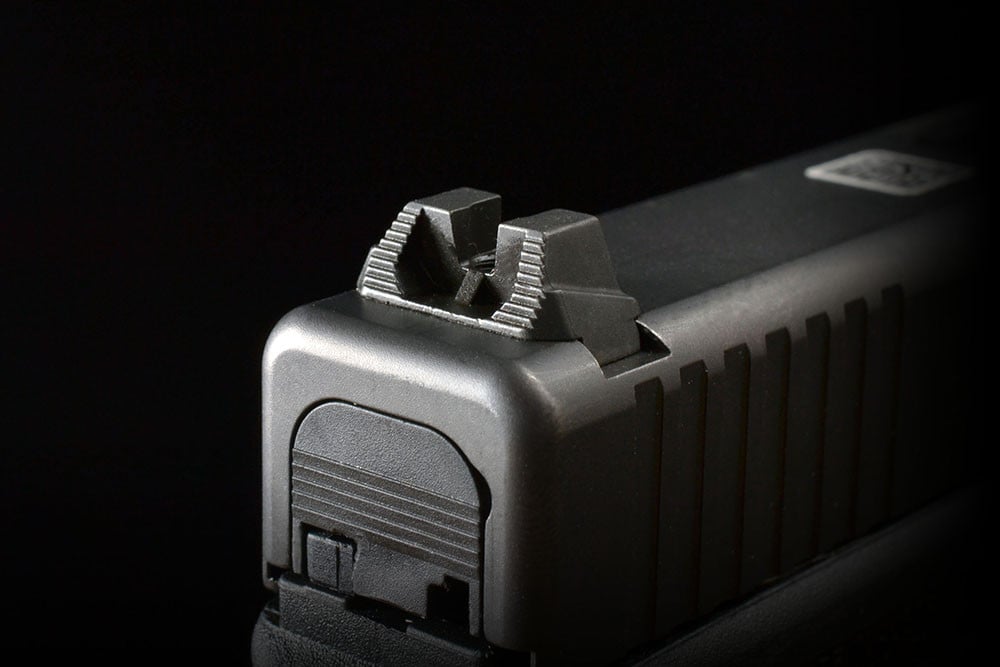 The rear sight is tapered to offer the best compromise between narrow and wide rear sight notches. Narrow notches help with accuracy, but can be slower to align and obscure more of the target. Wider rear notches tend to be faster, and offer greater visibility, however the margin for error in a misaligned sight picture is increased. With a narrow base for finer alignment, and a more generous top, allows the shooter to have the advantages of both. Additionally, the Index Ramp on the rear sight offers a way to quickly confirm proper sight alignment and can be marked for greater visibility.