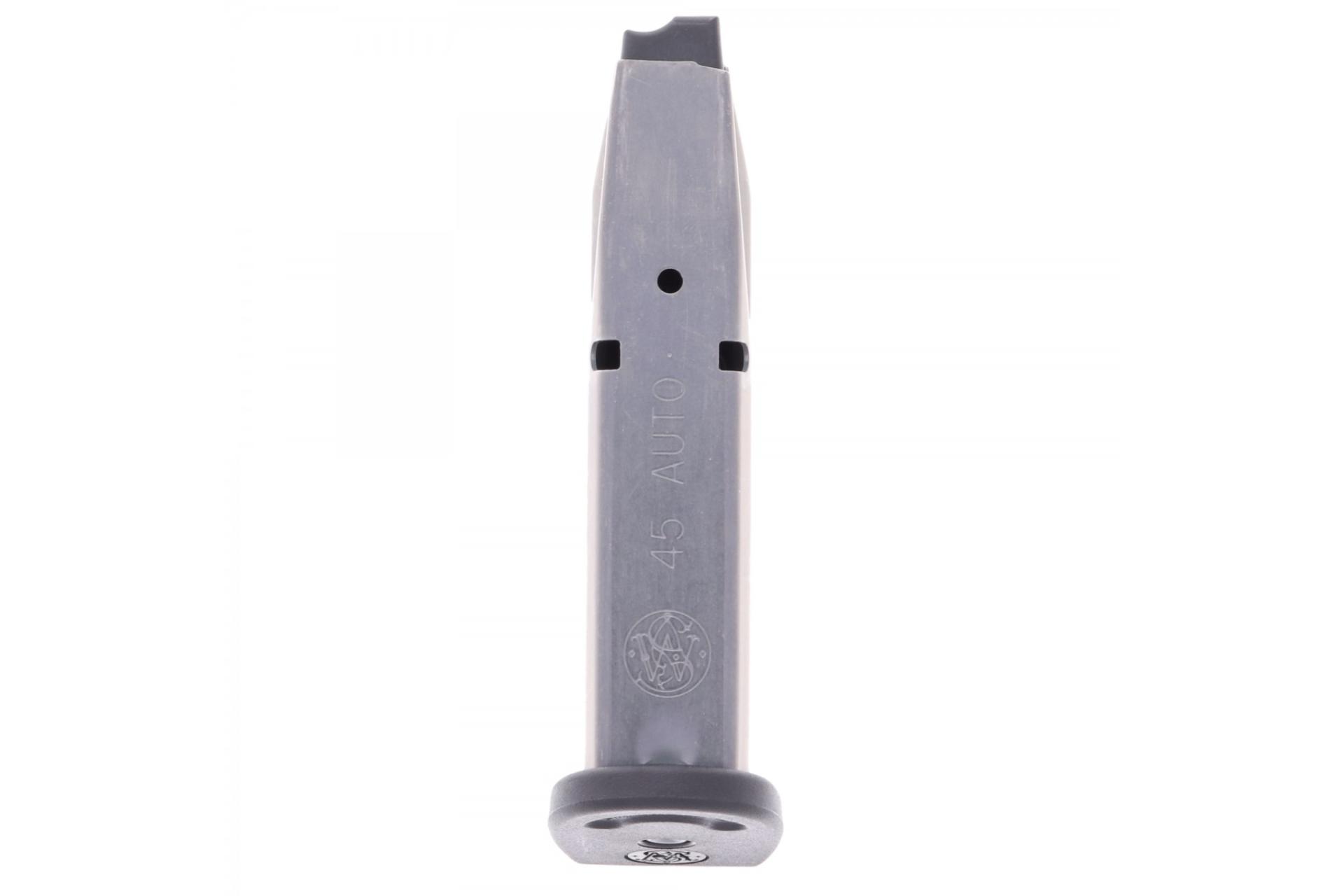 SKU: 21403 Category: Magazines DescriptionBuilt from durable stainless steel with an impact-resistant polymer baseplate for superior strength, the Smith & Wesson® S&W M&P™ Compact .45 ACP 8-Round Factory Magazine will help you get the most out of your M&P Compact 45. The heat-treated steel wire spring and durable polymer follower ensure smooth, reliable feeding every time so you can have peace of mind in high-stress target or defensive environments. Plus, wide-cut witness holes provide quick, easy round counts on the fly. Smith & Wesson’s M&P 45 delivers classic big-bore stopping power in a state-of-the-art, American-made, striker-fired pistol that’s tough enough for military & police use. These factory magazines sit flush with your pistol for maximum concealment and a smooth, snag-free draw to deliver 8 rounds of hard-hitting .45 ACP in a compact package. Grab a few spares today!