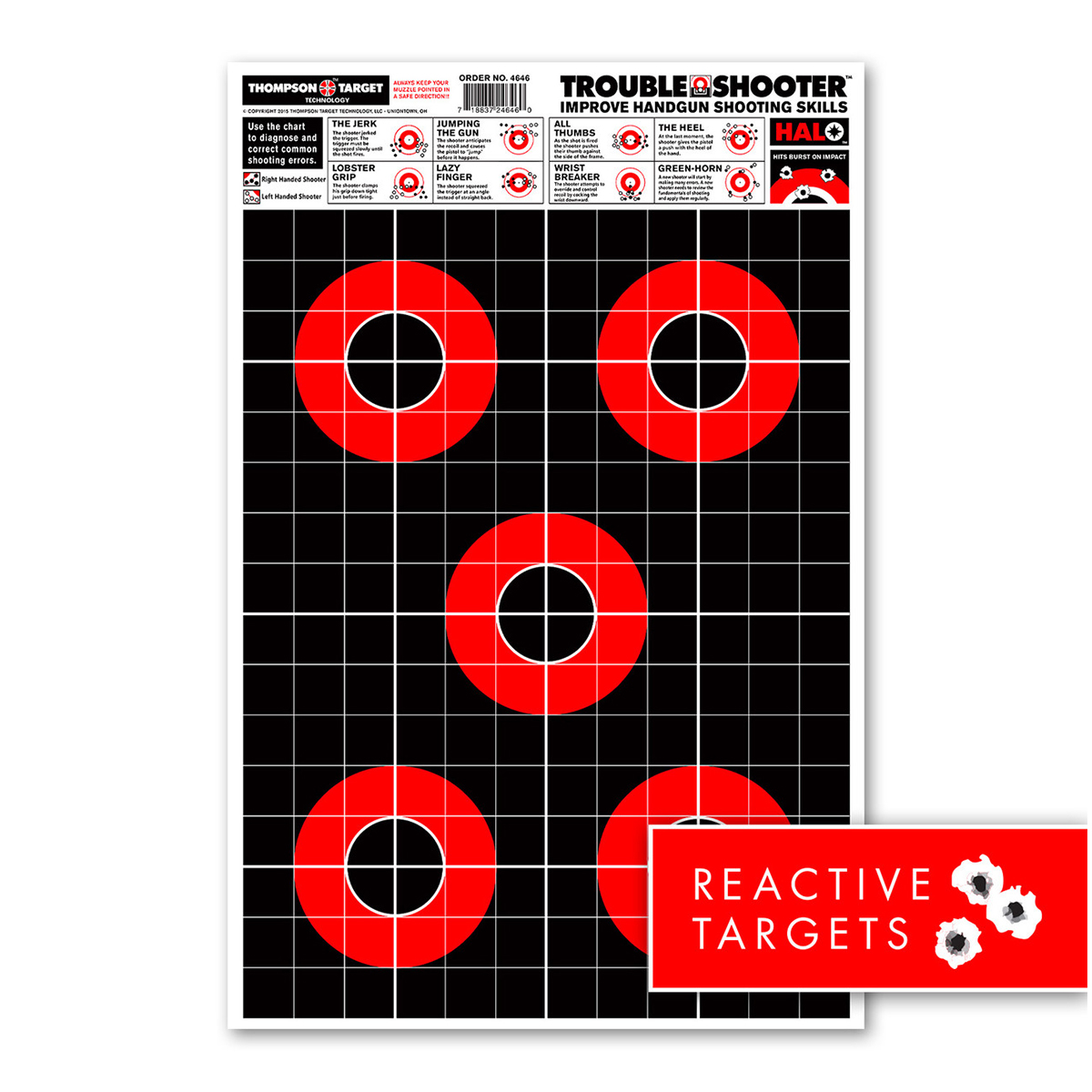 Are you looking to improve your handgun shooting accuracy? Look no further than Thompson’s new HALOTM Trouble-Shooter handgun diagnostic reactive targets. We’ve taken the diagnostic training information from our best selling paper Trouble-Shooter diagnostic targets and incorporated it into this new 12.5″x19″ reactive target.