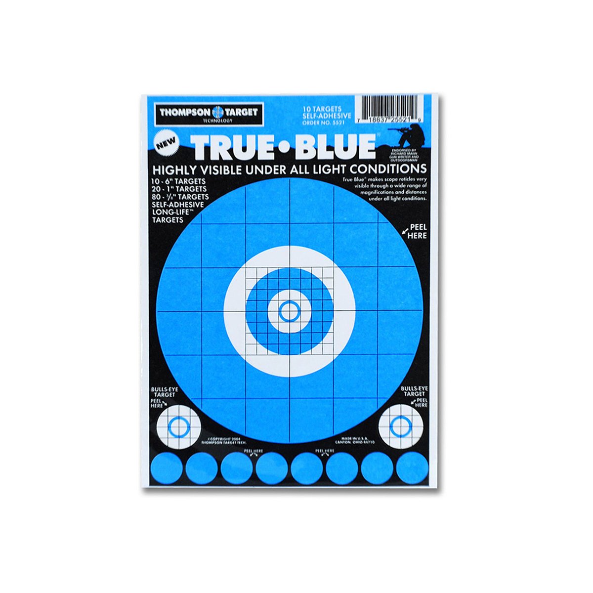 SKU: 23440 Category: Targets DescriptionThe True Blue adhesive targets were developed specifically for high visibility under low light or direct light conditions. The specially formulated bright blue ink gives you a clear down range image in low light situations such as shooting at dusk hours. They are also made with vellum shine free paper which provides greatly reduced glare in direct sunlight situations.