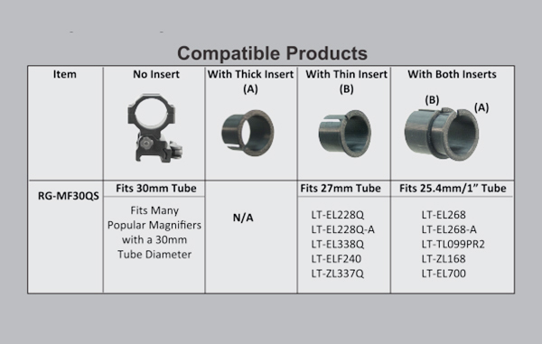 - Complete with 2 Inserts to Use with a Wide Range of Flashlights or Other Accessories with 30mm, 27mm or 1″ Diameter