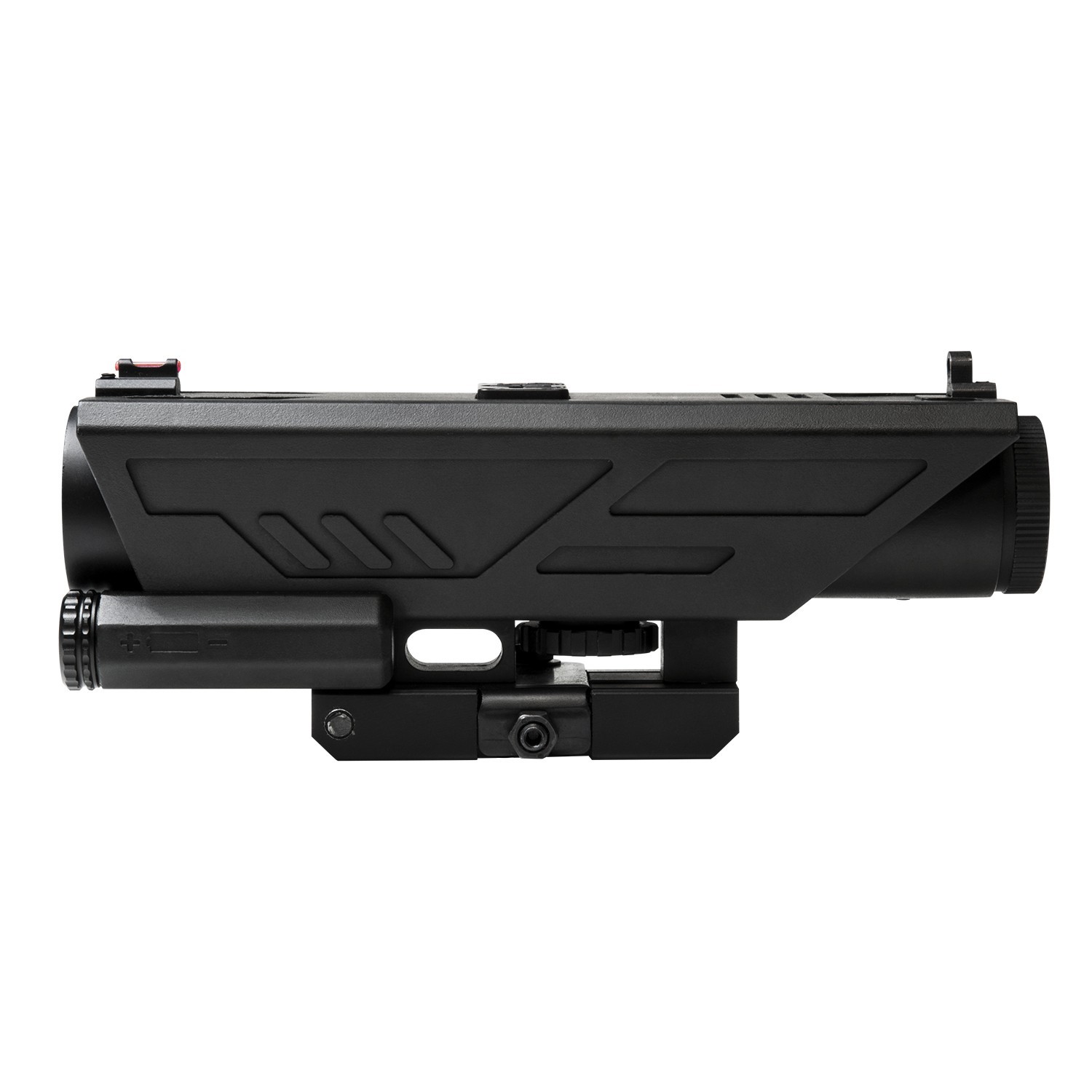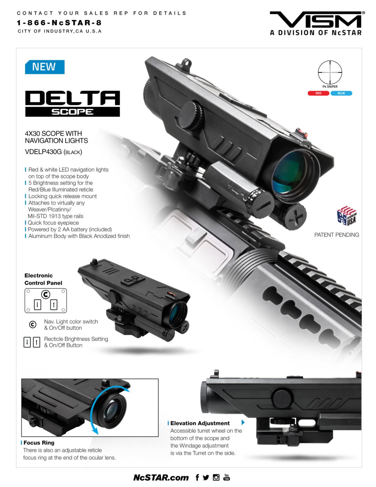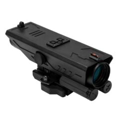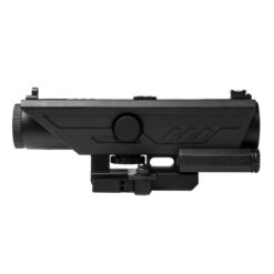 SKU: 5233 Categories: Optics & Sights, Rifle Scopes DescriptionDelta 4X30mm fixed magnification scope with Red & White LED Navigation lights and top mounted Back-Up Iron Sights. The Electronic Control Panel is placed on top of the scope for Ambidextrous use. You can turn On/Off the Illuminated Reticle & LED NAV Lights, adjust the brightness level of the Illuminated Reticle, change select the Illuminated Reticle Color (Blue or Red) and the LED NAV Lights (White & Red). There are five brightness settings for the Illuminated Reticle. Elevation adjustment is done with the accessible turret wheel on the bottom of the scope and the Windage adjustment is via the Turret on the side. New GEN3 Integrated Auto Locking Quick Release Mount, fits Weaver/ Picatinny/ MIL-STD 1913 type rails. Features a redesigned and more compact lever.