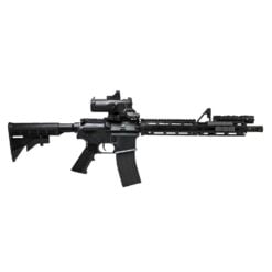 4X Magnification 34mm scope with two forward mounted Green Laser pod and Red/White LED Navigation light pod with a secondary micro Red Dot optic mounted to the top of the scope. Top mounted Backup Iron rear peep sight and Fiber Optic front sight post. There is three different mounting positions for the Iron Sights left and right offset and top 12 o’clock position. Black anodized aluminum body.
