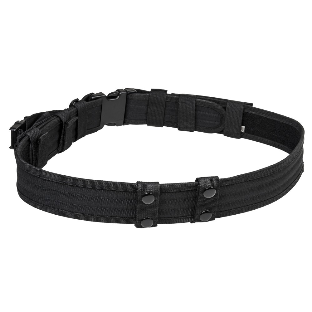 - 2.25″ Tactical Belt with large quick connect buckle and with two horizontal magazine pouches. The Tactical Belt is ajustable for waist sizes 32″ to 49″ via hook and loop fasteners.