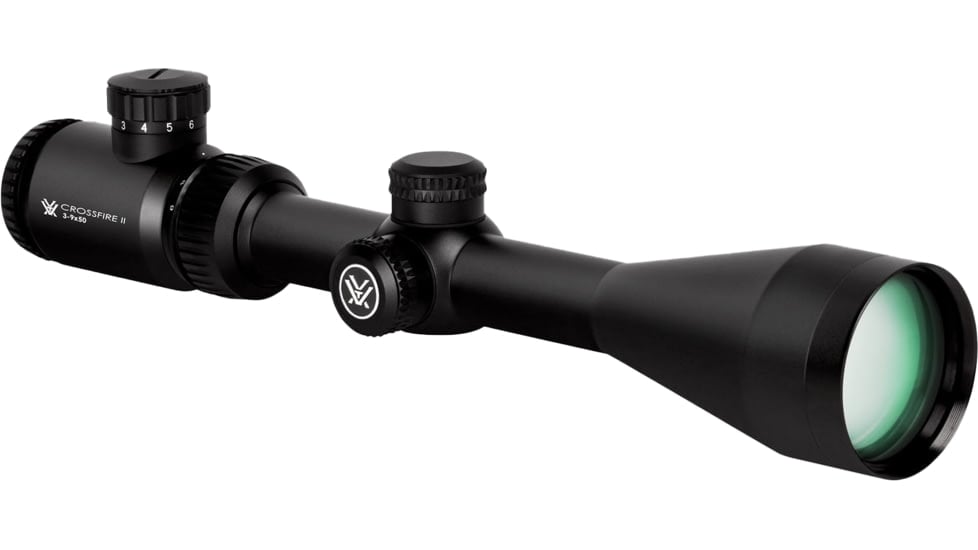 SKU: 12955 Category: Rifle Scopes DescriptionVortex Crossfire II 3-9×50 Rifle Scope is a complete re-design of the original Crossfire Rifle Scope, adding even more brightness, accuracy, and reliability to the already-trusted Crossfire scope design. Equipped with a wide, 50mm objective lens and fully multi-coated optics, these Rifle Scopes from Vortex Optics will deliver excellent brightness and contrast, even in low light situations like dawn or dusk. A single-piece, 1-inch tube made from aircraft grade aluminum adds strength and accuracy. The windage and elevation turrets are capped for extra resilience to impact and feature a quick reset-to-zero function. The Crossfire II Rifle Scope is waterproof, nitrogen purged for fog proofing, and shock proof, so you can take it on your most demanding hunts. Capture more game in the crosshairs with the Vortex Optics Crossfire II 3-9x50mm Fast Focus Rifle Scope.