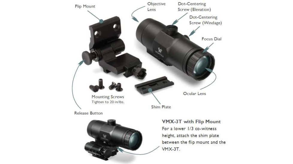 SKU: 4252 Categories: Daily Deals on AR15 Parts, Excluded from Codes, Optics & Sights DescriptionSimple, fast, effective. The push-button design of the VMX-3T engages and disengages the flip-mount, allowing the magnifier to lock in place. The result, 3x magnified or unmagnified views at will. Optics are fully multi-coated for optimal light transmission. Lightweight and tough, hard-coat-anodized machined-aluminum construction ensures durability. Internally nitrogen purged for reliable waterproof/fogproof performance. Ultimate magnified versatility for virtually any AR-height red dot sight.