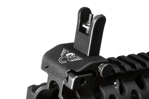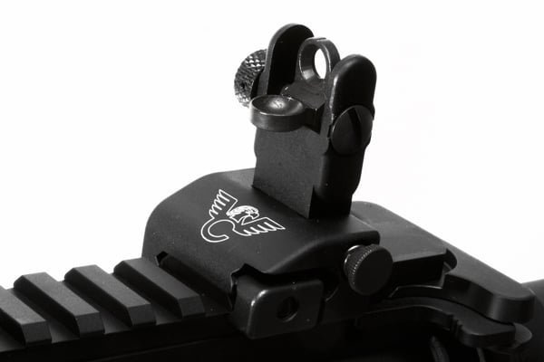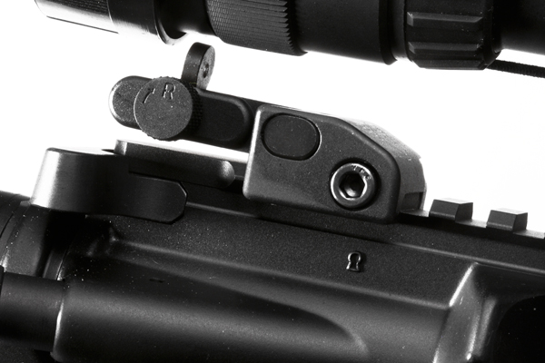 - Rear sight has a dual peep (A2 style) aperture on same plane